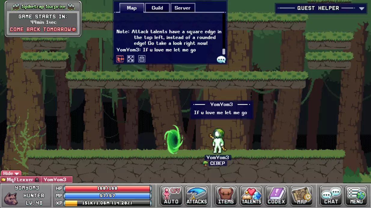 第三,每小时结束时会举办迷你游戏“尖刺陷阱”,该游戏的奖励每天只能获得一次。尽可能长时间存活,根据存活的回合数可获得最多40颗宝石。 若要进入该迷你游戏的地图,请在聊天框输入“If u love me let me go”(注意大小写,且不要在公会/服务器聊天框输入)。 侧边平台总是意味着死亡,因此务必始终避开它们!只要能存活到至少第二轮,你就能获得宝石。 如果你在第一轮死亡,则无法获得宝石,但可以在接下来的一小时内重试。