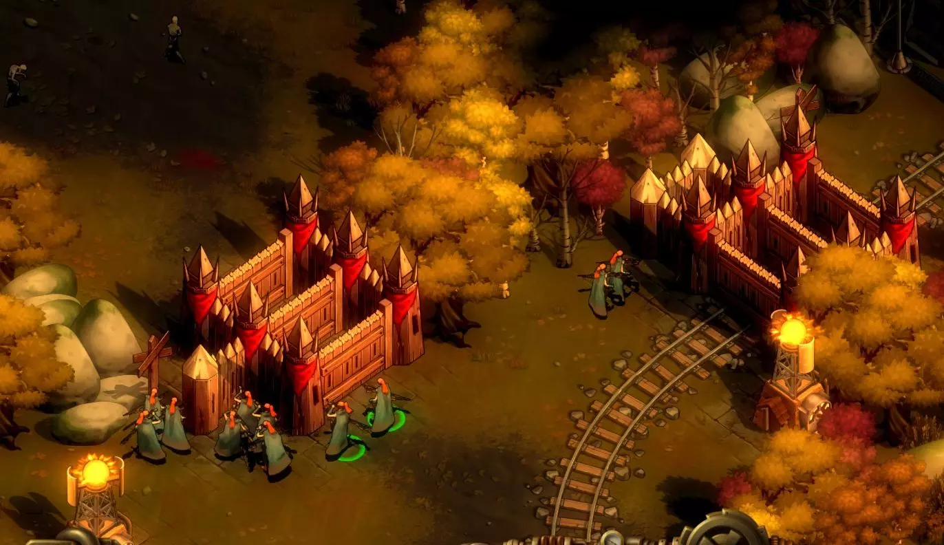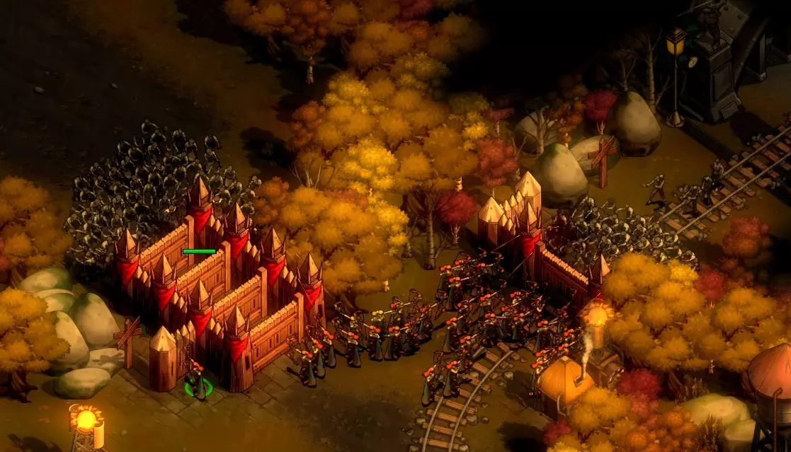 采石场遗址西南方向的后方聚集着一大群感染者。在大波感染者来袭前,你需要先清除这些敌人,否则可能会被包抄——但要小心。让你的游侠保持距离,一次只吸引少量敌人,避免他们被 overwhelm(压制)。如果他们贸然冲进去,就会沦为感染者的午餐。 这片区域藏有一个物资箱,里面有食物。选中一名游侠后右键点击物资箱即可拾取,但要等附近的尸潮被消灭后再行动。采石场遗址处还有一个物资箱,里面有少量石头(不过远远不够我们使用,你仍然需要建造采石场)。 密切关注殖民地的北端至关重要。偶尔会有感染者从北方游荡下来。如果发生这种情况,你需要让你的游骑兵做好准备。同样,如果你惊动了采石场后方西侧的任何一群敌人,他们就会跟随你回到殖民地。 一旦周边区域清理干净,我们就可以专注于防御了。 **防御建筑** 老玩家可能会谈论塔楼、炮塔和陷阱,但现在还为时过早——你在这里不会拥有这些东西。除了你的部队本身,你抵御尸潮的手段只有一个。 那就是围墙。 建造围墙需要大量木材(希望你已经建造了第二座锯木厂?或许可以考虑建造第三座?),你可以用树干样式的木墙围绕殖民地。由于围墙既能阻挡敌人,也会阻挡友军,因此还有(更昂贵的)大门,仅对友方单位开放。(出于某些不合逻辑的原因,墙壁(和你所有的建筑一样)需要建在特斯拉塔附近,尽管它们并不需要电力。别问我为什么。) 这里很容易让人想在整个殖民地周围建一堵高墙。但请忍住这个冲动。你没有那么多时间,而且一旦建了高墙,殖民地就无法向外扩张了。建造高墙所需的大量木材、黄金和人力,会让你在完成一半之前就被感染者吃掉脑子。你最好利用殖民地周围已有的自然防御——森林、岩石、河流——这些你的单位和感染者都无法穿越的地形,并封锁最狭窄的入口。 此外,墙壁也没那么好用。僵尸最终会突破这些防御——当有上百只僵尸啃咬大门时,速度会非常快。你所有的围墙能做的,就是为你的部队争取消灭敌人的时间。 对于这张地图,你只需要建造两段短围墙,就像这样: