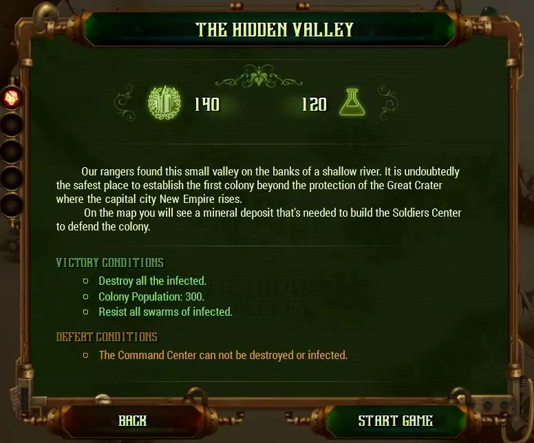 对于第一个任务,其实选择哪个都无关紧要。需要说明的是,你在这里并不会使用这两位勇士中的任何一位。他们会在“英雄任务”中发挥作用,而那些任务会在之后出现。在此之前,你需要先成功建立第一个殖民地并生存下来。我尝试过这两位英雄,虽然他们的风格有所不同,但并没有所谓的“最佳”选择。你只需挑选自己喜欢的那位即可。 其次,你需要选择难度等级。我第一次游玩时选择了默认的50%难度,即便如此,我还是尝试了好几次才过关。如果你觉得自己足够勇敢,可以将难度提高到100%。要是你想挑战极限,甚至可以把难度调得更高,但既然你正在阅读这篇攻略,显然你在第一个任务上就已经需要帮助了。所以,别给自己增加不必要的难度。 在这次攻略中,我将难度设置为100%。本指南中的所有截图均来自同一次游戏流程。 准备好了吗?很好。点击任务,查看具体要求。 **任务目标** 以下是任务目标。你需要完成所有目标才能通关该任务。信不信由你,这已经是游戏对你手下留情了。
