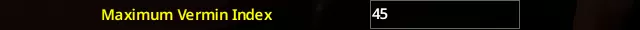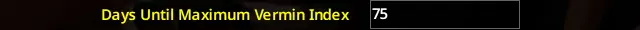 作为一个曾生活/现在生活在农村地区的人,你会惊讶于田鼠/普通老鼠/啮齿动物能多快占据你房产的各个区域。我只能想象并担心,在世界末日住在半城市环境会是什么样子。这个选项大约是原版设置的不到两倍,我认为这完全合理。 最大害虫指数所需天数:75