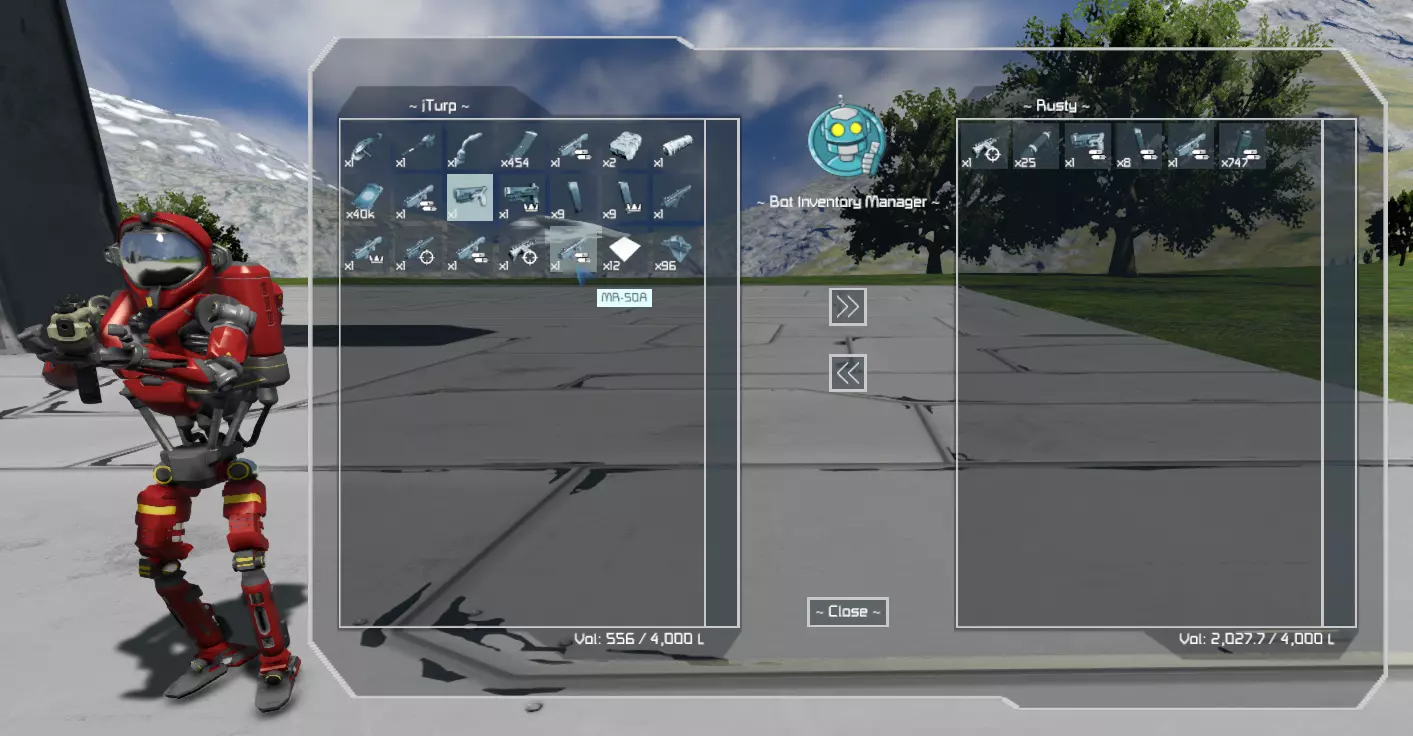 物品栏 - 打开一个图形用户界面菜单,允许在玩家和机器人的物品栏之间移动物品;其功能类似于普通物品栏界面,具备拖放功能以及用于批量移动物品的修改键。以下是该菜单的外观。