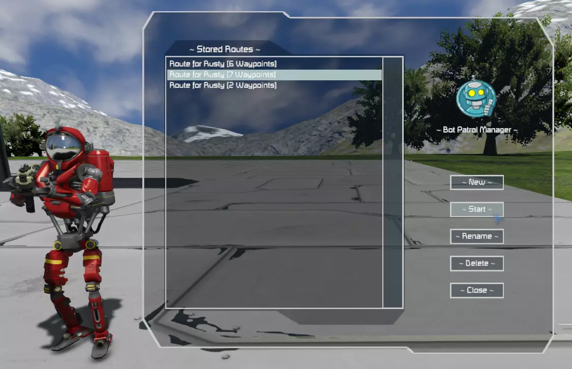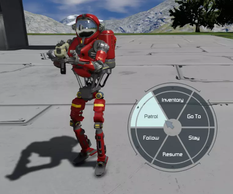 建造助手后,当你瞄准它时,它会高亮显示,并弹出提示“按F键互动”(实际按键取决于你设置的“使用”键)。按下对应按键后,会出现命令轮盘,你可以通过它向助手下达指令。 默认助手行为 - **战斗机器人/拾荒机器人**:会跟随主人移动,并攻击进入主人可配置范围内的敌人。 - **维修机器人**:会寻找友方方块进行修复或建造,并清理漂浮物体。 - **船员机器人**:会执行分配的任务;若未分配任务,则会像流浪者一样在基地内游荡。 指令 - **前往**:将机器人派往选定位置(也可让它们坐到座位上);机器人会从该位置开始巡逻,直至被召回。这也是用于为船员机器人分配角色的功能。 - **停留**:机器人将停留在当前位置并停止所有功能。 - **恢复**:在发出前往、停留、跟随或巡逻命令后使用,使机器人恢复到上述定义的正常/默认操作状态。 - **跟随**:机器人将跟随其所有者,不会偏离执行任何其他操作。 - **巡逻**:打开一个图形用户界面菜单,允许你创建巡逻路线或从先前创建的路线列表中选择,也可以删除或重命名它们。所有路线都保存到文件中,并随世界一同加载。以下是该菜单的外观。