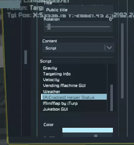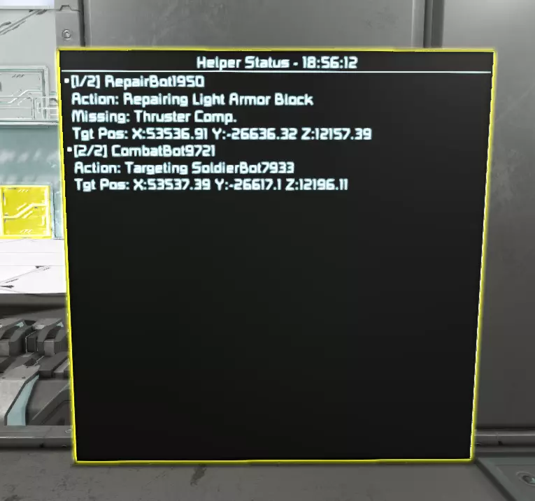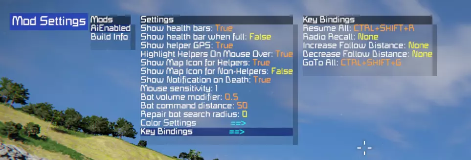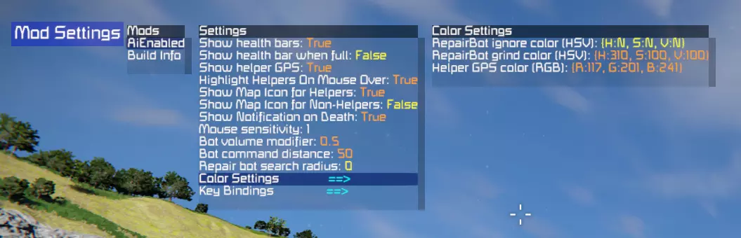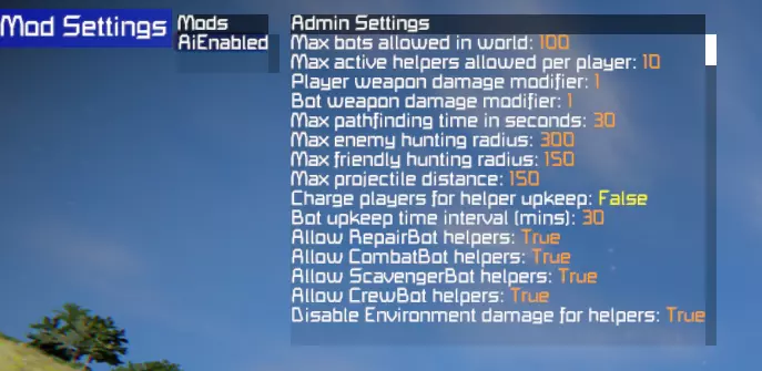 Configuration Files (Player and Admin) NOTE: It is preferable to use the admin / player mod menus for items that are included! However, some items, such as the allowed bot types, can only be changed via the config file. See the Mod Menu section for items that you can change in-game on the fly! Admin Config The AiEnabled admin config file can be found in the world storage folder Location: SpaceEngineers(Dedicated) Saves #### World_Name Storage<?xml version="1.0" encoding="utf-16"?> <SaveData xmlns:xsd="http://www.w3.org/2001/XMLSchema" xmlns:xsi="http://www.w3.org/2001/XMLSchema-instance"> <MaxBotsInWorld>100</MaxBotsInWorld> <MaxHelpersPerPlayer>10</MaxHelpersPerPlayer> <AllowRepairBot>true</AllowRepairBot> <AllowCombatBot>true</AllowCombatBot> <AllowScavengerBot>true</AllowScavengerBot> <AllowCrewBot>true</AllowCrewBot> <ObeyProjectionIntegrityForRepairs>true</ObeyProjectionIntegrityForRepairs> <DisableCharacterCollisionOnBotDeath>false</DisableCharacterCollisionOnBotDeath> <MaxBotProjectileDistance>75</MaxBotProjectileDistance> <MaxBotHuntingDistanceEnemy>75</MaxBotHuntingDistanceEnemy> <MaxBotHuntingDistanceFriendly>75</MaxBotHuntingDistanceFriendly> <MaxPathfindingTimeInSeconds>30</MaxPathfindingTimeInSeconds> <PlayerWeaponDamageModifier>1.5</PlayerWeaponDamageModifier> <BotWeaponDamageModifier>1</BotWeaponDamageModifier> <AllowBotMusic>false</AllowBotMusic> <AllowNeutralsToFly>false</AllowNeutralsToFly> <AllowEnemiesToFly>true</AllowEnemiesToFly> <AllowHelpersToFly>true</AllowHelpersToFly> <AllowNeutralTargets>false</AllowNeutralTargets> <AllowIdleMovement>true</AllowIdleMovement> <AllowIdleMapTransitions>false</AllowIdleMapTransitions> <AllowHelmetVisorChanges>true</AllowHelmetVisorChanges> <EnforceWalkingOnPatrol>true</EnforceWalkingOnPatrol> <EnforceGroundPathingFirst>false</EnforceGroundPathingFirst> <IgnoreArmorDeformation>false</IgnoreArmorDeformation> <AllowHelperTokenBuilding>true</AllowHelperTokenBuilding> <AllowedHelperSubtypes /> <AllowedBotSubtypes /> <AllowedBotRoles /> <PlayerHelperData /> ExplanationsMaxBotsInWorld - how many bots can be in the world at one time MaxHelpersPerPlayer - how many active helpers a player can have at one time Allow**Bot - toggles ability to build the given bot type ObeyProjectionIntegrityForRepairs - attempts to maintain build ratio as it's projected (experimental) DisableCharacterCollisionOnBotDeath - toggles physics disabling when bots die MaxBotProjectileDistance - how far in meters bot projectiles are allowed to travel MaxBotHuntingDistance** - how far away bots will attempt to find a target. Note that large distances can affect performance! MaxPathfindingTimeInSeconds - how long the pathfinding algorithm will run before giving up. The larger the grid, the higher this should be set! **WeaponDamageModifier - will multiply the given weapon damage by this amount. This is damage inflicted, not damage received. AllowBotMusic - if true, bots will occasionally sing a short song verse. Allow**ToFly - toggles the ability for the given type to fly. Only affects new spawns! AllowIdleMovement - toggles the ability for bots to wander around when they don't have a target. Disabling this can improve performance. AllowIdleMapTransitions - toggles the ability for bots to wander outside of their starting map area. AllowHelmetVisorChanges - if true, bots will raise and lower their helmet visor depending on the oxygen level. EnforceWalkingOnPatrol - if true, bots will be forced to walk when they are traversing patrol points. IgnoreArmorDeformation - if true, Repair Bots will not attempt to repair blocks that only contain deformation damage. AllowHelperTokenBuilding - toggles the ability for players to build bot materials in assemblers. AllowedHelperSubtypes - [Config item only] changes the allowed character models that will be shown in the RoboFactory terminal window. AllowedBotSubtypes - [Config item only] changes the allowed character models that are allowed to be spawned globally. AllowedBotRoles - [Config item only] changes the allowed bot roles that are allowed to be spawned globally. Player Config The AiEnabled player config can be found in the local storage folder Location: SpaceEngineers(Dedicated) Storage<?xml version="1.0" encoding="utf-16"?> <PlayerData xmlns:xsd="http://www.w3.org/2001/XMLSchema" xmlns:xsi="http://www.w3.org/2001/XMLSchema-instance"> <ShowHealthBars>true</ShowHealthBars> <ShowHealthWhenFull>true</ShowHealthWhenFull> <ShowHelperGPS>true</ShowHelperGPS> <HighlightHelpersOnMouseOver>false</HighlightHelpersOnMouseOver> <MouseSensitivityModifier>1</MouseSensitivityModifier> <RepairBotSearchRadius>0</RepairBotSearchRadius> <RepairBotIgnoreColorHSV xsi:nil="true" /> <RepairBotGrindColorHSV x="330" y="100" z="100" /> <HelperGpsColorRGB x="125" y="50" z="200" /> <Keybinds> <SerializableKeybind> <Key>R</Key> <Shift>true</Shift> <Ctrl>true</Ctrl> <Alt>false</Alt> <Action>RecallBots_Used</Action> </SerializableKeybind> </Keybinds> <PatrolRoutes> <Route World="AiEnabled Test World" Name="Route for CombatBot8052 [2 Waypoints]"> <GridEntityId xsi:nil="true" /> <VoxelWaypoint x="52920.502398177567" y="-27433.29197173081" z="12233.166631412951" /> <VoxelWaypoint x="52925.968563831724" y="-27426.317724192893" z="12225.130826458824" /> </Route> </PatrolRoutes> </PlayerData> ExplanationsShowHealthBars - toggles showing of health bars above bots ShowHealthWhenFull - toggles showing of health bars for helpers when they are at full HP ShowHelperGPS - toggles showing helper GPS waypoints HighlightHelpersOnMouseOver - toggles highlighting helpers when aiming at them MouseSensitivityModifier - adjusts the mouse sensitivity when navigating in game bot menus RepairBotSearchRadius - adjusts how far your Repair helpers will search for targets, in meters RepairBotIgnoreColorHSV - adjusts the Ignore Color for your Repair helpers to use, in HSV RepairBotGrindColorHSV - adjusts the Grind Color for your Repair helpers to use, in HSV HelperGpsColorRGB - adjusts t