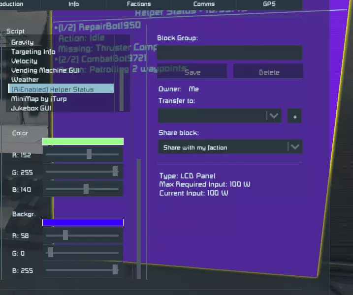 修复机器人 - 可执行轻度焊接/研磨操作以及物品清理(焊接需消耗组件)。 - 会对所有与所有者为友方关系的方块进行焊接。 - 仅会研磨与用户在模组菜单中配置的研磨颜色相匹配的方块。 - 会根据需要动态切换焊接/研磨模式。 - 你可以在工厂终端界面中通过勾选/取消勾选“优先焊接”来更新焊接/研磨的优先级。若进行了更改,点击“更新助手优先级”可将更改应用到所有活跃的机器人。 - 启用研磨模式的步骤: 1. 设置你的研磨颜色。 2. 将部分方块涂成该颜色。 3. 确保机器人的 inventory(物品栏)中有研磨机(无需装备)。