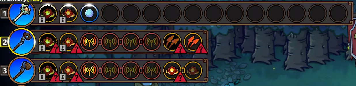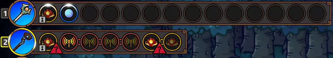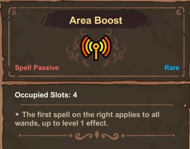 当区域强化为法杖添加被动效果时,其顺序为:先作用于最高级的法杖,然后按从左到右的顺序依次添加。对模仿法杖使用区域强化时,会为所有法杖添加一个模仿效果,而非复制模仿法杖当前正在复制的内容。利用这两个特性,我们可以将一个法术放置在最下方的法杖上,并将所有想要强化的模仿法杖放在其他法杖上或该法杖的左侧,从而实现对单个法术的多次复制。