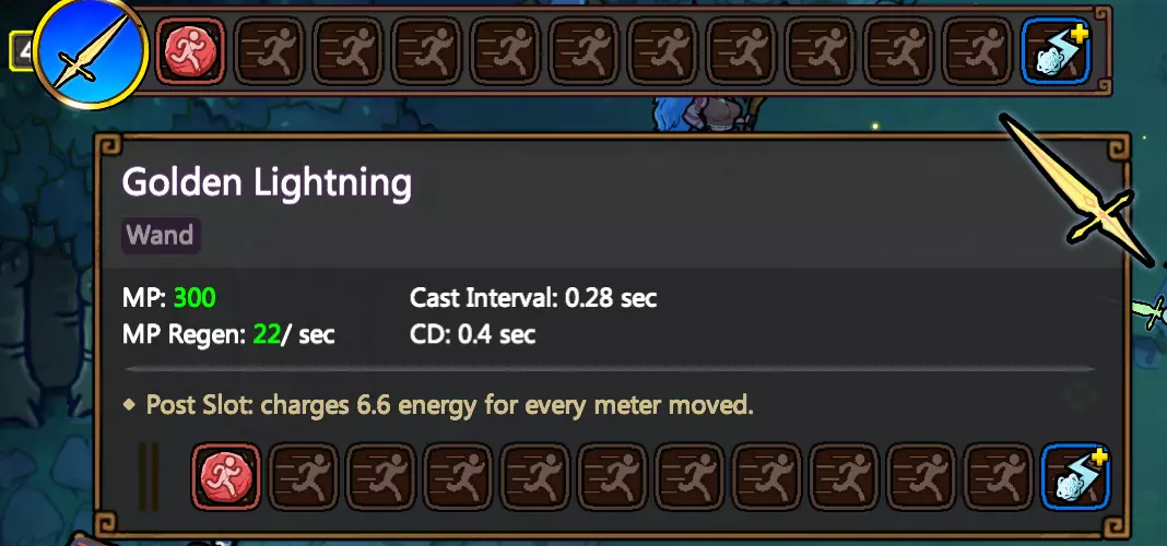 次级充能本质上是在法杖右半部分施放法术时的一种替代魔力资源。以黄金闪电为例,我们每移动1米就能生成5点能量。因此,如果闪电充能的魔力消耗为33点,那么我们大约每移动6米就能施放一次。这一机制忽略法杖上的任何施法间隔和冷却时间属性。