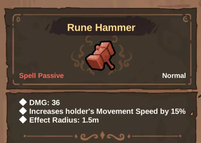-符文锤 符文锤是一种用于构建符文围绕效果的有趣法术。使用符文锤时,你可以忽略魔力值消耗、魔力恢复和施法速度等属性,专注堆叠伤害。由于无法通过二重奏将伤害转移到符文锤上,其伤害存在一个上限,但凭借多个锤子同时在场时的快速触发频率,你仍能实现极高的每秒伤害。它最适合作为毒/燃烧流派的伤害来源,或作为带有额外增益法术的储备法杖的附加伤害。无论装备何种法杖,符文锤都会持续在场,但移动速度加成仅在使用装配了符文锤的法杖时生效。