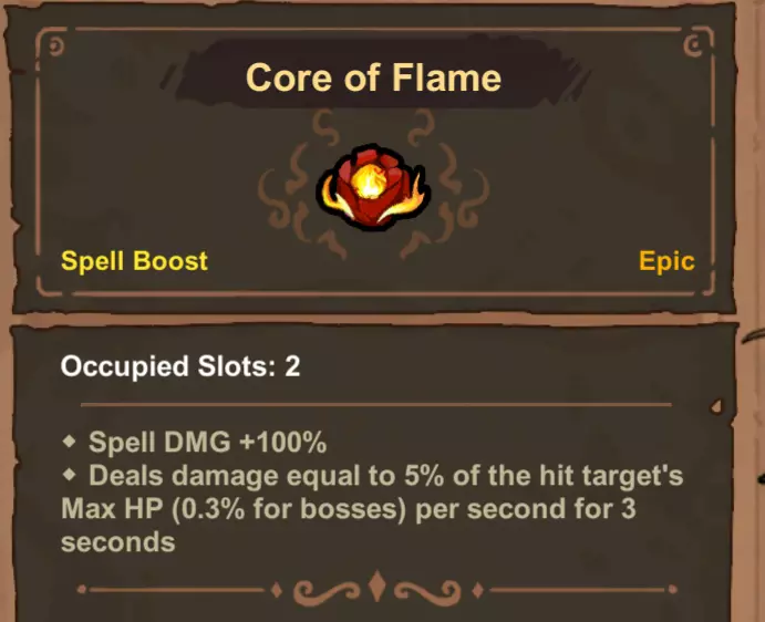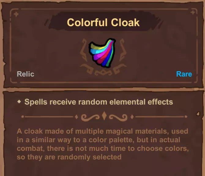 如果与随机火焰来源(例如多彩斗篷遗物)配合使用,一旦通过该遗物对敌人施加了火焰效果,即使之后不再通过斗篷触发火焰,增加的伤害也会一直持续到敌人身上的减益效果消失为止。