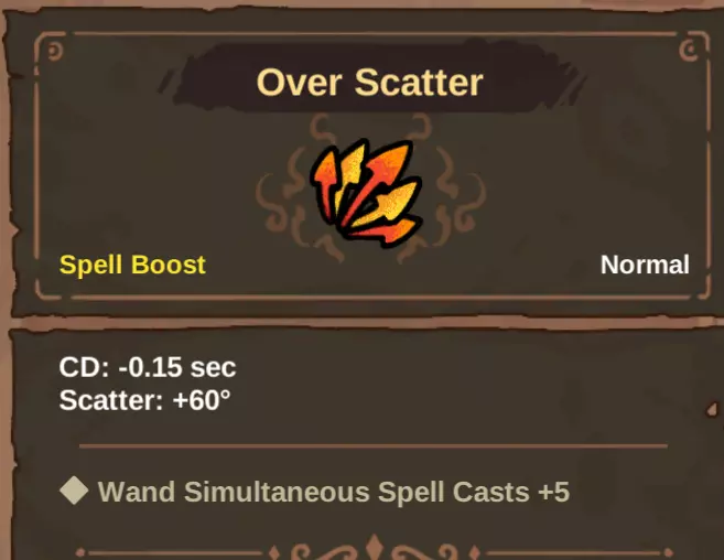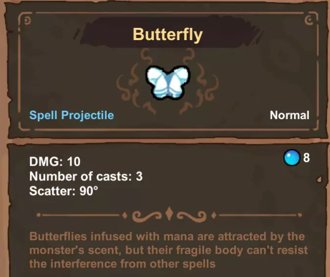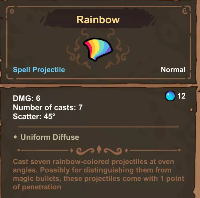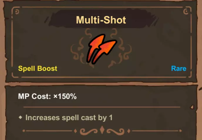 -施法次数 此设定适用于“彩虹”与“蝴蝶”法术。为这些法术添加“多重射击”会使其施法次数呈乘法叠加。例如,“多重射击1”可使“蝴蝶”的蝴蝶数量从3只增加到6只。当与负载法术配合使用时,每次法术施法都会独立触发连锁效果。例如,在“彩虹”之后添加“二重唱”,“二重唱”将被触发7次。这是在你的法杖上获取多个高伤害法术副本的另一种方法。