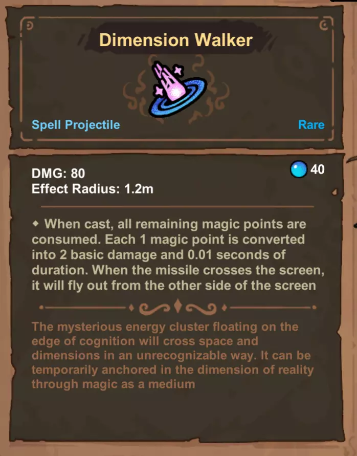 -维度行者 你可以提升维度行者的潜在伤害,但需要同时施放多个。最佳方式是配合多重射击,或是能同时施放所有维度行者的投射物法术。若使用施法次数机制,或像奥术新星这样的投射物法术,只会使第一个维度行者达到最大伤害,其余则受限于你的法力恢复速度。尽管奥术新星通常有固定的施放数量,但维度行者在施放时会消耗你剩余的所有法力来提升自身伤害。
