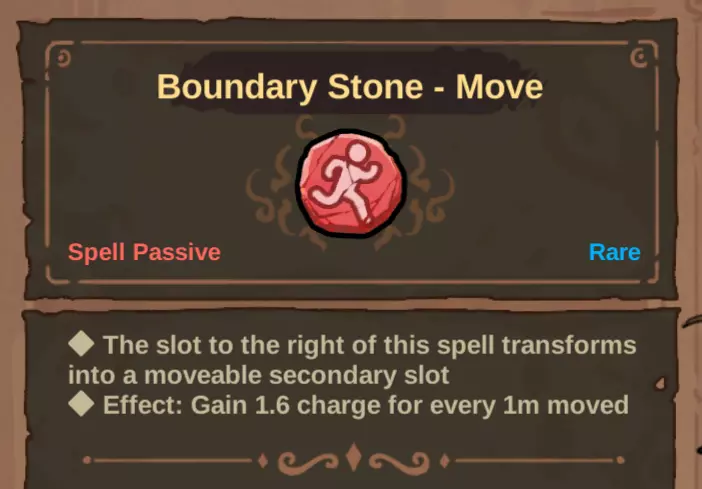 边界石的作用是将其右侧魔杖的任意部分转变为次级充能区域。以移动石为例简单说明,我们可以将“金色闪电”上的所有插槽都变为基于移动的充能插槽。充能方式也会叠加,因此现在每次移动我们能获得6.6能量。