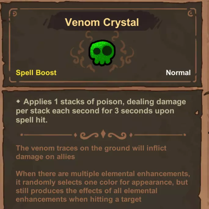 - 毒素 毒素层数呈线性叠加,可实现无限伤害增长。攻击敌人的速度越快,叠加的层数就越高。毒素持续时间取决于法杖上最高等级的毒素被动技能。若要构建毒素流派,只需尽可能快速地攻击敌人以积累最多层数,法术本身的伤害并不重要。此外,构建毒素流派时需注意,组合法术会减少毒素的施加量。由于只需关注攻击速度和法力消耗,这使得法杖有大量额外空间可用于堆叠低等级毒素以获得更多层数。