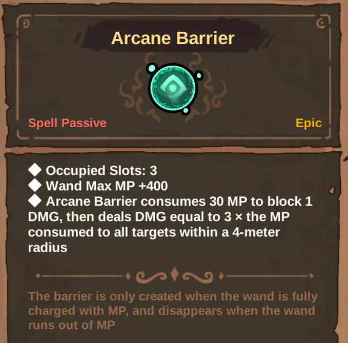 -奥术屏障 消耗法杖30点魔力值吸收1点伤害。魔力耗尽后,屏障将失效,直至魔力完全恢复。生成者造成6点接触伤害,我认为其攻击频率为每秒2次。若能达到360点魔力回复,生成者将无法击杀你。魔力上限的提升受魔力储备和魔法藤蔓影响。
