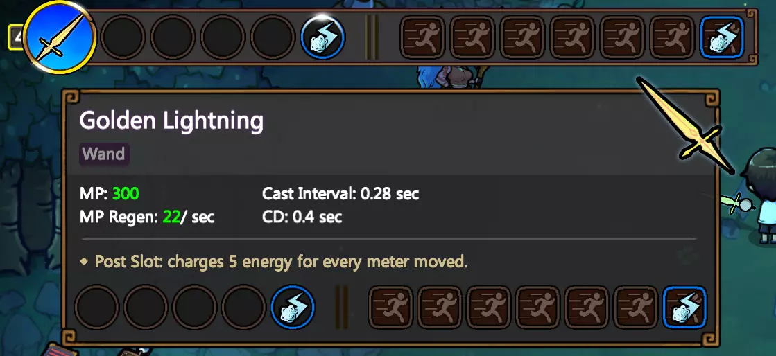 将整根法杖转换为次级充能时,添加“魔力转换器”可进一步提升效率。由于设计此类法杖时,法杖的回魔属性无关紧要,因此可以将其全部转化为充能效率。充能效率会增加法杖从相关动作中获得的充能值。以“黄金闪电”为例,我们可以添加一个魔力转换器,将22点魔力回复转化为44%的充能效率,这样每移动1米就能获得7.2点充能。