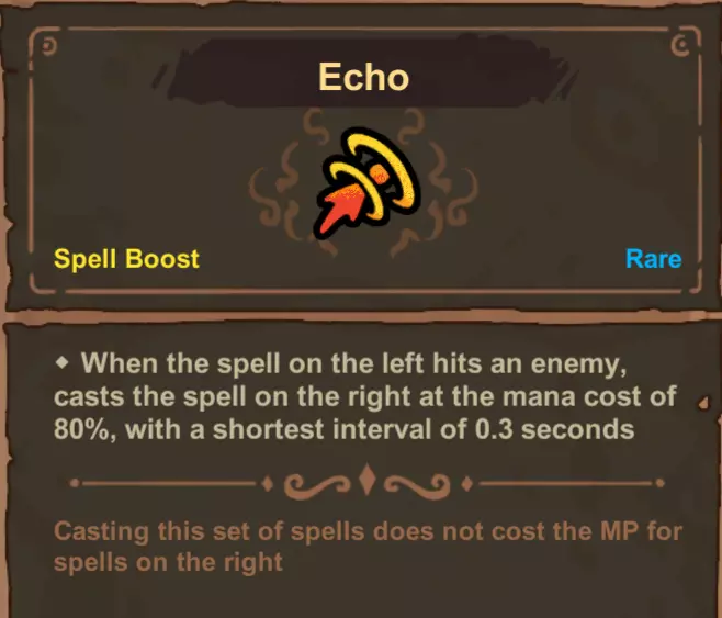 由于次级充能法杖的运作机制,你无法用从区域强化获得的法术强化来增益法杖的右半部分。这些强化效果总会作用于法杖的左半部分。虽然你可以轻松叠加核心火焰之类的效果,但你仍然可以利用其他加成。尽管无法获得许多蠕虫法术的加成,但你仍能获得可转换为充能区域的额外法杖槽位。虽然强化效果只作用于其所在的一侧,但被动效果仍会影响整个法杖。通常来说,如果你要玩充能构筑,最好强化区域强化,这样你就能把高等级的宁静之花从伤害法杖上移开,从而腾出更多空间来装备魔法藤蔓。进行拟态连锁时,你可以始终将“边界石”或“魔力转换器”作为第一个法术复制,以获得更多总充能。 - 错误的百科条目 我认为这些是之前版本遗留下来的问题。百科中关于“烟火”“连环”和“回响”的条目与我本指南中的内容相矛盾。施放带有“烟火”的法术,你的消耗并不会变为四倍。而施放带有“回响”或“连环”的法术时,注意观察你的魔力条会被消耗。