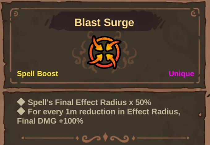 -爆炸涌动 另一个略显奇特的蠕虫法术——爆炸涌动。该法术通过减小效果半径来提升法术伤害。并非所有法术都具备效果半径,例如魔法飞弹(Magic Bullet)就没有。即便添加了爆炸涌动,我们造成的伤害依旧只有10点。