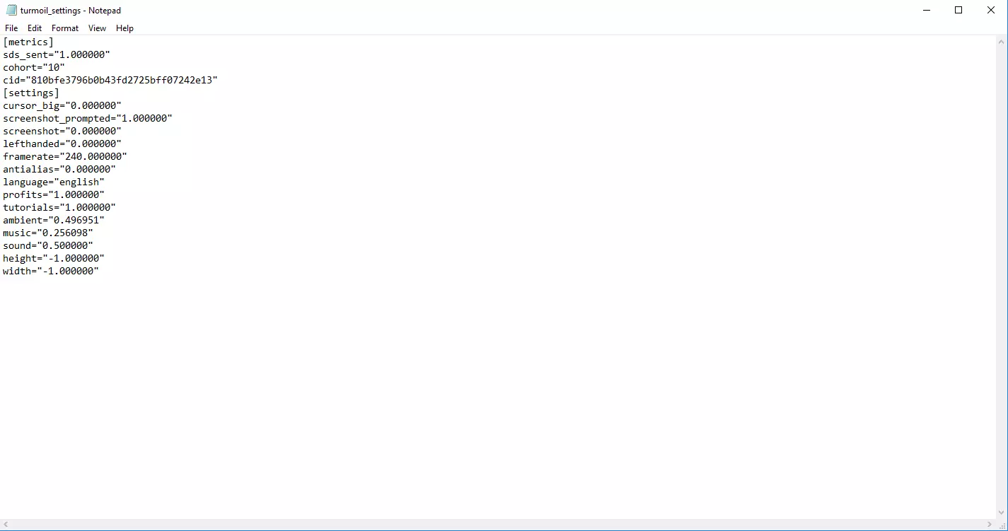 在本快速指南中,我将向你展示如何在《石油骚动》中解锁帧率上限至144及以上。 turmoil_settings.ini 编辑说明:不要将帧率设置超过90,否则会导致游戏运行速度过慢。 1. 导航至C:/Users/"你的用户名"/AppData/Local/TurmoilSteam 2. 打开turmoil_settings.ini文件 3. 找到framerate="60.000000"这一行,将其中的数值修改为你想要的帧率上限。**注意:不要将数值设置超过90,否则会大幅降低游戏运行速度。**