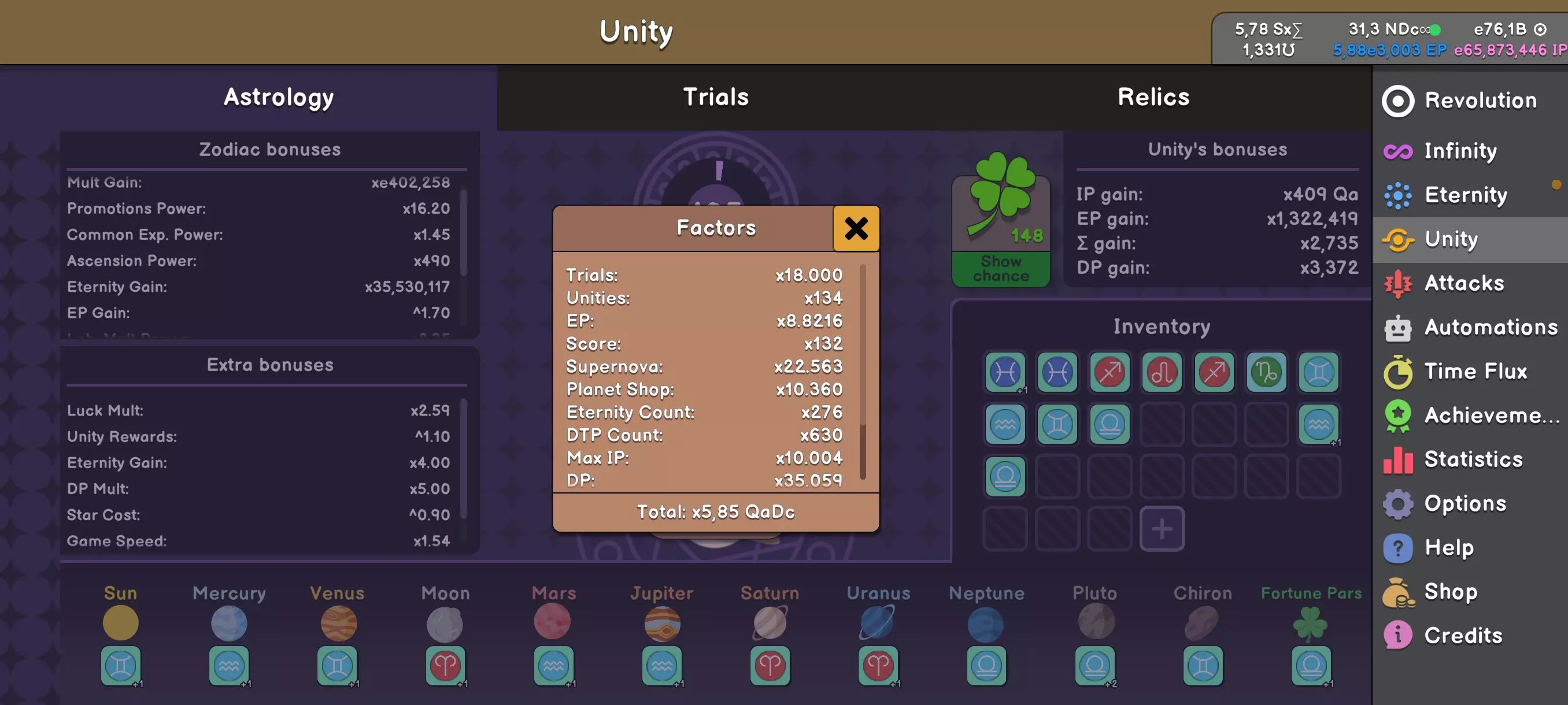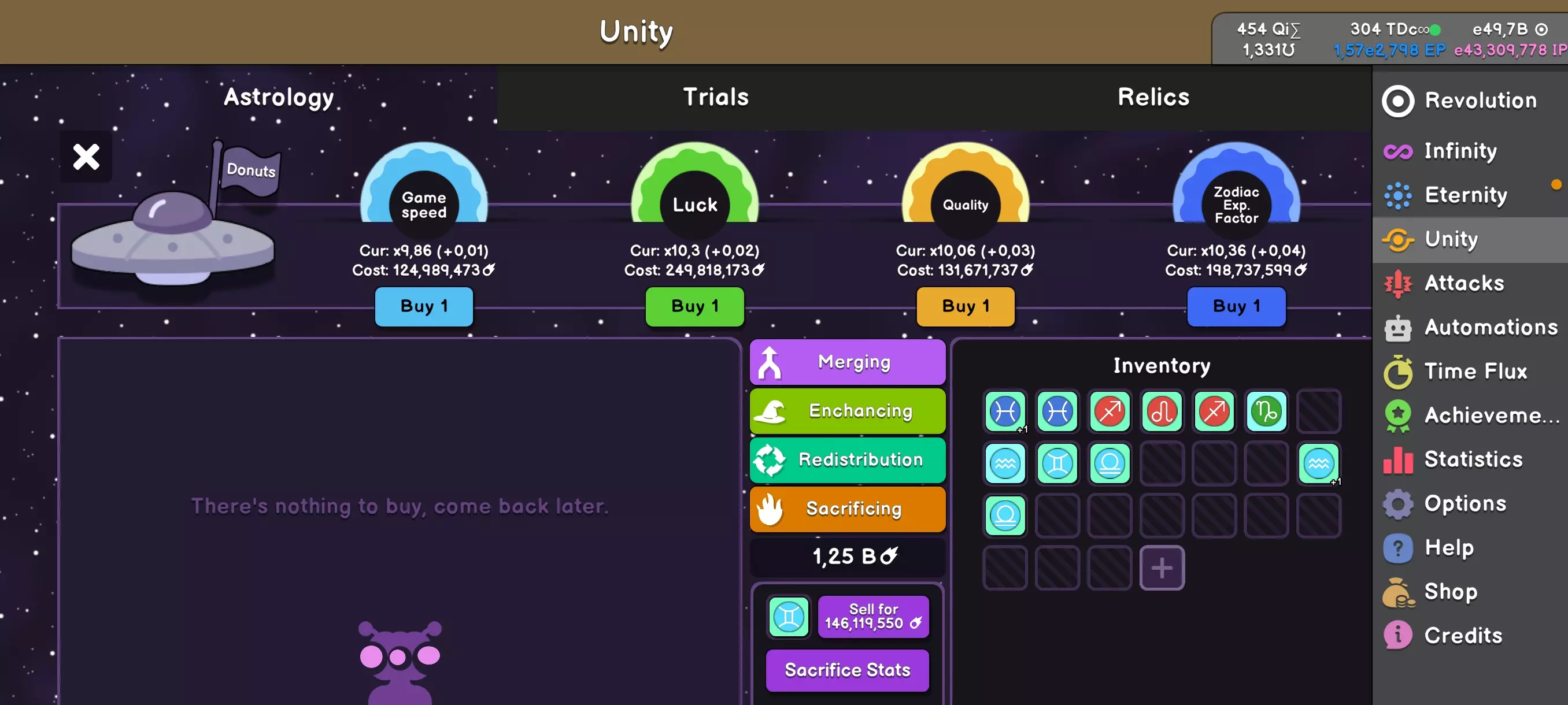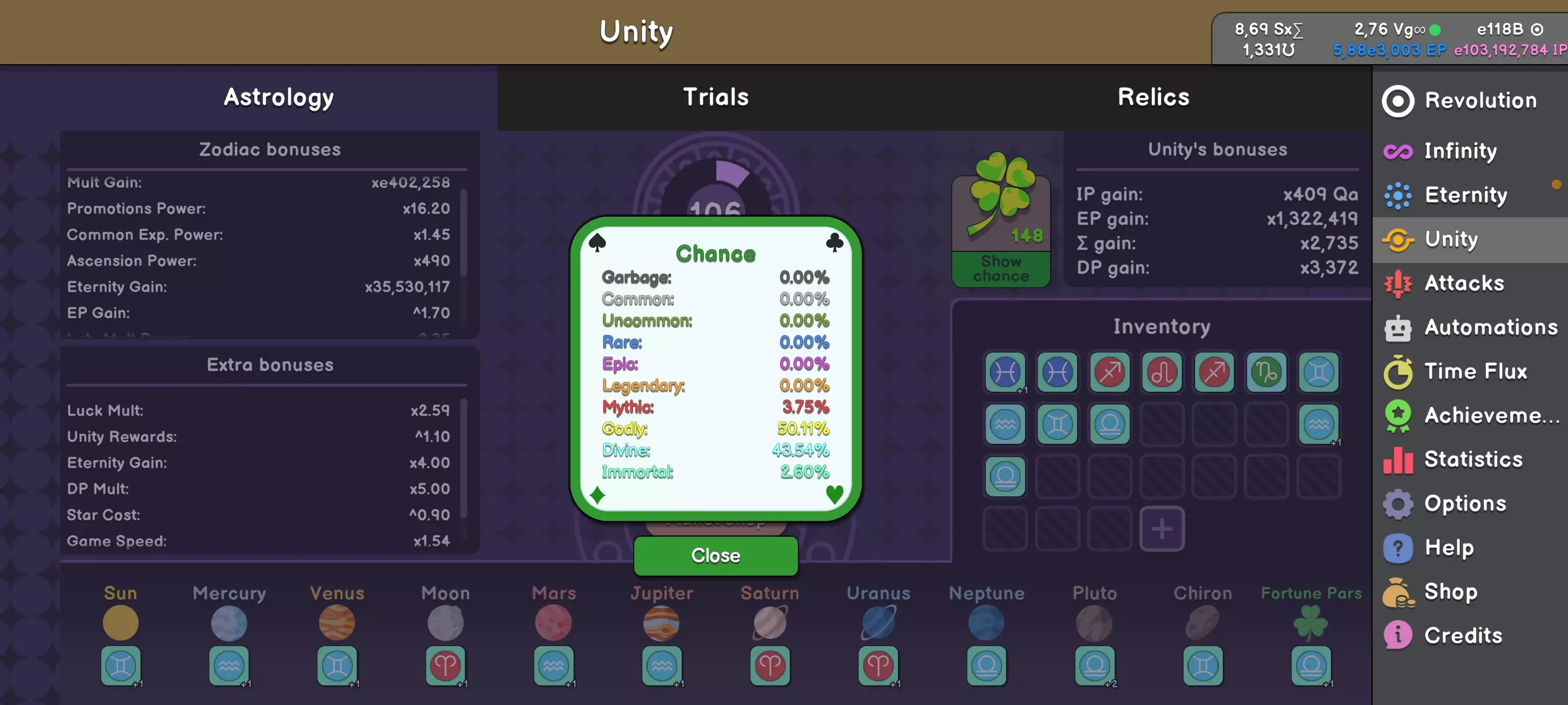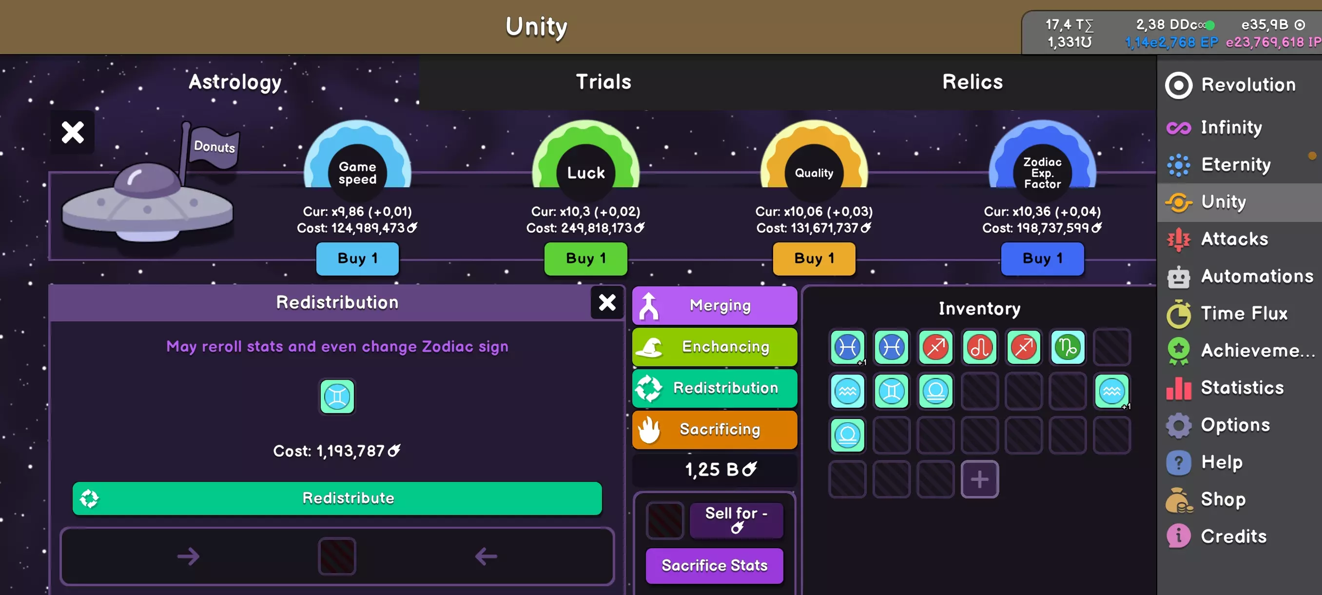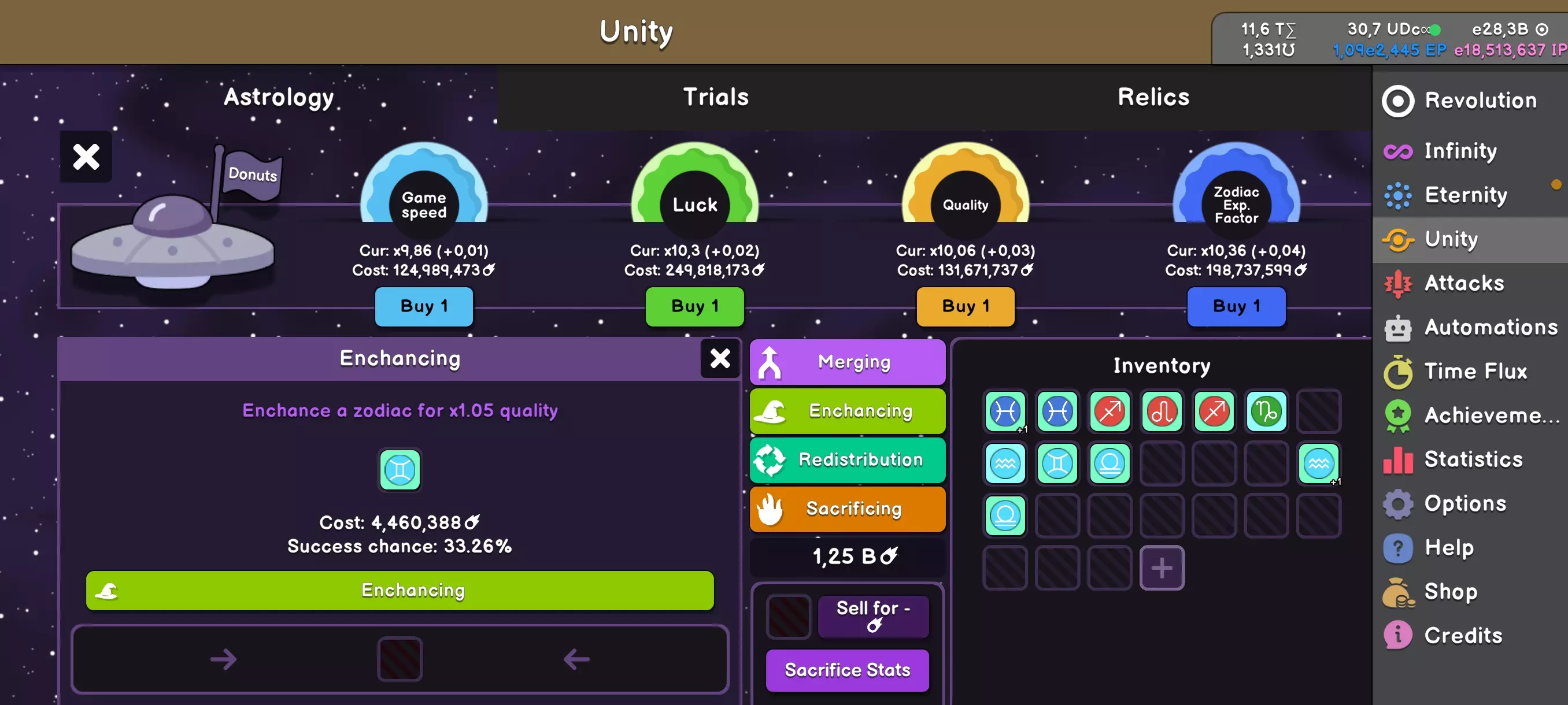 Unity是一场关于黄道十二宫的游戏。你将拥有12个黄道十二宫符号,每个符号最多可拥有4种预设强化效果,它们可能具有不同的品质、等级,总体上能带来不同的加成。 首次Unity将在你获得1.13e2466永恒点数后开启。点击“永恒”后会出现Unity选项,你将获得4个黄道十二宫符号供选择。 通常在游戏初期最有用的是具有“多重增益”(Mult Gain)选项的白羊座(Aries)符号。它们能显著提升点数获取,并极大地帮助完成初期的黄道十二宫任务,但具体细节稍后再谈。如果你运气不佳,在首次Unity中没有抽到白羊座,可以花费少量游戏内货币重新抽取新的符号,但不要过度使用此功能,这些点数可以用来购买更多更有用的选项。
