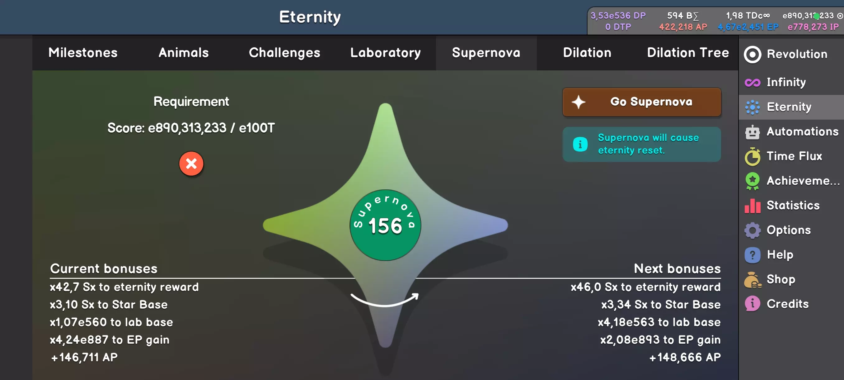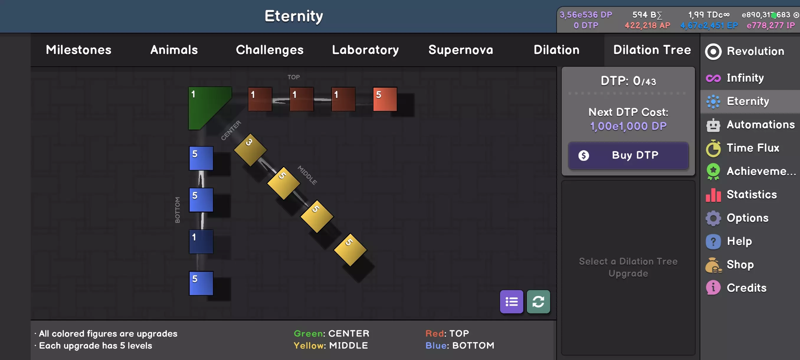 我们有一棵“树”——中央点是绿色三角形,从它延伸出3个分支——红色(顶部)、黄色(中间)和蓝色(底部)。树的每个元素都非常有用,但可惜也很昂贵。用于分配的DTP(扩张树点数)需要用DP购买,而DP是在“扩张”(Dilation)中获得的点数。前3个点数很难获得,之后到40个相对容易,超过40个后又会变得困难。 需要记住,我们的目标是最大化获得的DP。为了实现这一点,我们需要尽可能高的“超新星”(Supernova)等级、大量的AP点数(目标在50万左右)以及尽可能多的“永恒”(wieczności)。 整个玩法在于不断切换三种build——一种用于获取AP,一种用于获取DP,第三种用于提升“超新星”。所有的难点在于理解如何针对特定收益构建角色,以及何时在不同构建之间进行切换。让我们先解释一下技能树各个元素的作用: C1 - 中心1,绿色三角形 - 提升使用未消耗AP时的DP生成量 T1 - 顶部1 - 红色正方形 - 强化“扩张升级1”(削弱诅咒效果) T2 - 顶部2 - 以永恒为幂提升DP生成 T3 - 顶部3 - 降低“超新星”的购买需求 T4 - 顶部4 - 强化底部分支 M1 - 中部1 - 黄色正方形 - 强化“扩张升级2”(增加DP) M2 - 中部2 - 生成永恒 M3 - 中部3 - 增强“超新星”带来的加成 M4 - 中部4 - 强化中部分支 B1 - 底部1 - 蓝色正方形 - 强化“扩张升级3”(实验室免费升级) B2 - 底部2 - 实验室免费升级 B3 - 底部3 - 每次“超新星”提升DP生成 B4 - 底部4- 优化顶级分支:构建加点方案时,我们希望最大化特定属性的提升——AP/DP/点数。推荐加点方案: AP:C1x1,T1x1,T2x1,T3x1,T4x5,M1x1,M2x1*,M3x5,M4x5,B1x5,B2x5,B3x1,B4x1。 DP:C1x5,T1x5,T2x5,T3x1,T4x5,M1x1,M2x1,M3x5,M4x5,B1x1,B2x1,B3x5,B4x5。 Supernova:C1x1,T1x1,T2x1,T3x5,T4x5,M1x1,M2x1*,M3x5,M4x5,B1x5,B2x5,B3x1,B4x5。 *此处建议将点数加满至5点,以便同时生成永恒值。 当然,这些都是加满后的加点方案,你无法立即构建完成。但这类方案能确保所选资源的最大提升。 还有一个难点——每次重置技能树都会损失已购买的1-3级强化的5%。如果频繁在加点方案之间切换而没有收益,你可能会损失属性提升!定期回到DP的建造界面并弥补损失。 [重要!] 统计数据 最后一个需要讨论的窗口是统计数据。