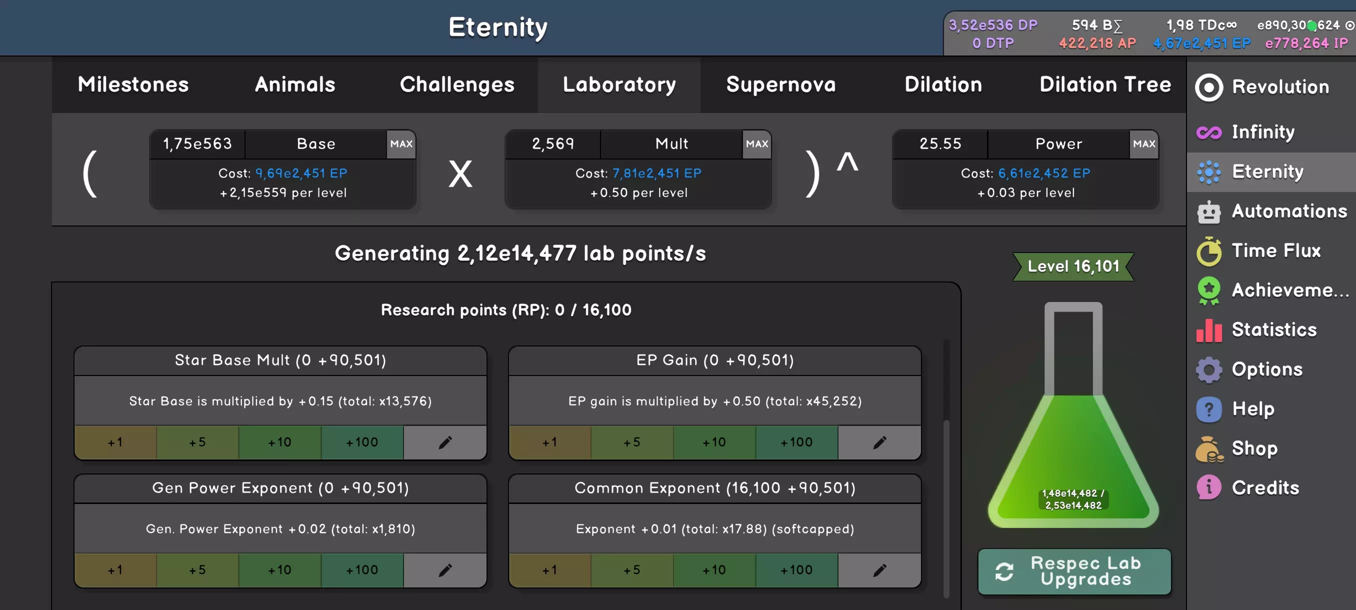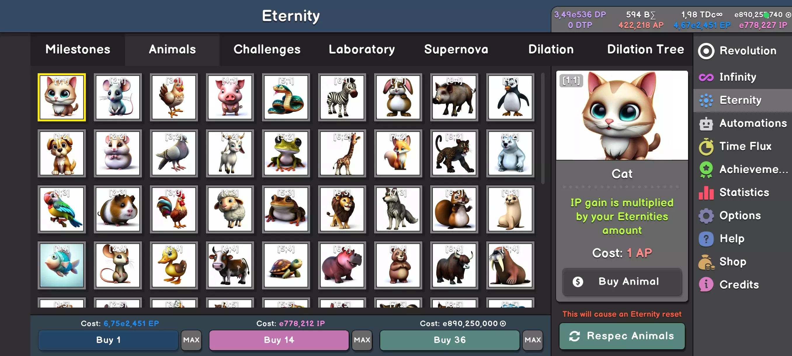 还记得那些无尽任务吗——解锁最后两个是多么困难?但这和这里的某些任务相比简直不值一提。这次规则略有变化。你将有10个任务,每个任务有5个难度等级。目标不再是永恒或无尽,而是特定的分数。每次完成任务会给你1点AP,以及对该挑战中被削弱的事物的某种永久加成。和往常一样——如果某个任务耗时太长,放弃它,你会以更强的状态回来。 现在让我们回顾一下里程碑。拥有X个宠物和Y个已完成的任务,将解锁更多内容,例如实验室(稍后介绍)、超新星(再晚一点)、膨胀(还要晚很多)以及许多便利功能。达到第32纪元后,你可以像破坏无限一样破坏它,并将成果兑换成货币来购买动物。 让我们回到实验室:
