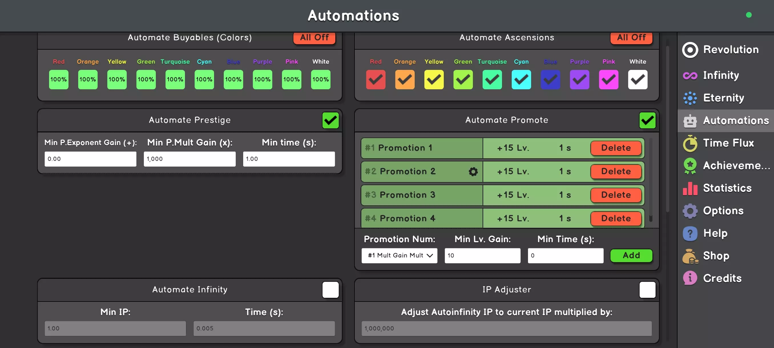 从现在开始,每次到达无限境界都将获得1点IP(无限点数)。进入升级界面,将点数投入第一个技能——此后,1号生成器(稍后会详细介绍)的强度将根据到达无限境界的次数而提升。此外,你还将解锁颜色自动购买功能——强烈建议始终保持开启,仅在特殊情况下关闭(这种情况确实会发生)。