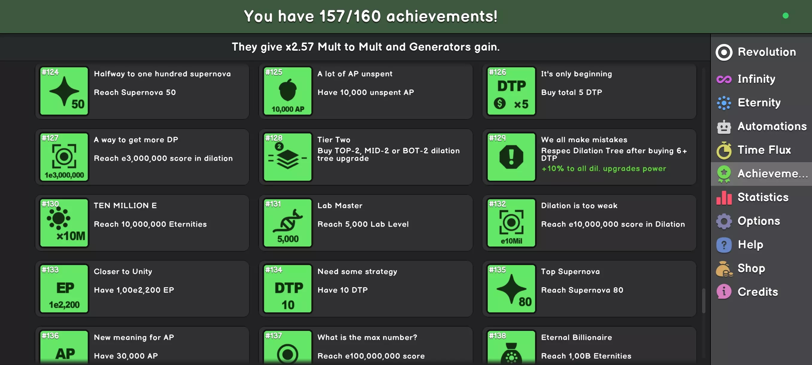 “超新星”是一个非常简单的机制,你很快就会忘记它。倒不是说它没用——它和之前所有机制一样强大,只是不需要玩家过多操作。 它更像是达成某个分数阈值的奖励。当你获得X点分数时,就能得到“超新星1”;获得Y点分数时,就能得到“超新星2”,以此类推。只需记得领取它就行。 每个超新星都是不同的增益效果——仅此而已。你继续游戏,直到解锁“时空膨胀”。 **时空膨胀与技能树** “时空膨胀”。放弃所有进度并重新开始游戏,你觉得如何?