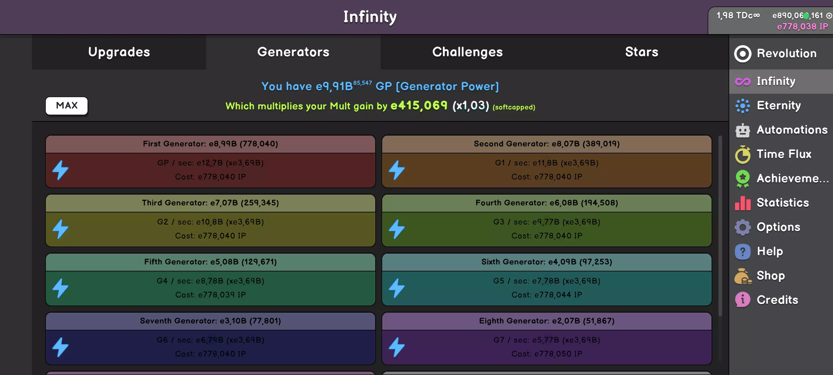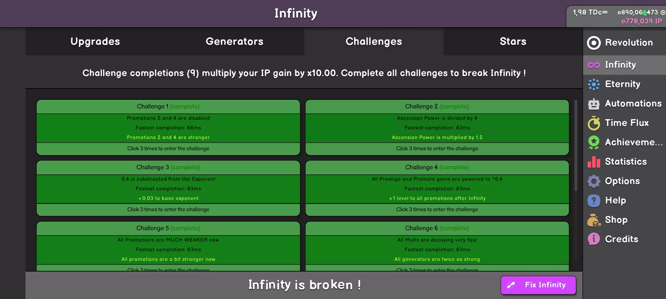 这些是非常实用的游戏修改器——前提是你能够完成它们。这些修改器难度相当不均衡,有的很简单,有的如果你没有适当升级发电机的话,可能需要花费好几天时间。任务各不相同,但目标始终一致——达成无限。有时它们会拿走你2次促销机会,有时时间会对你不利,有时它们会拿走你几种颜色。如果某个任务进展得异常艰难,不要勉强,等变强后再回来。 那么我们能得到什么回报呢?每完成一个任务,获得IP的倍率就会提升。零任务完成时为1倍,完成1个任务时为2倍,完成5个任务时为6倍。这似乎值得一试,不是吗?完成全部9个任务后,将解锁“打破无限”选项——你无需从头开始,而是可以继续游戏进程。想必你已经厌倦了反复从头开始吧?现在你可以将游戏体验延续更长时间。升级科技树和生成器,在关闭“打破”功能的情况下提升挑战的时间成绩,并获取更多IP,直至达到1 Dc IP。 去追逐星辰吧!