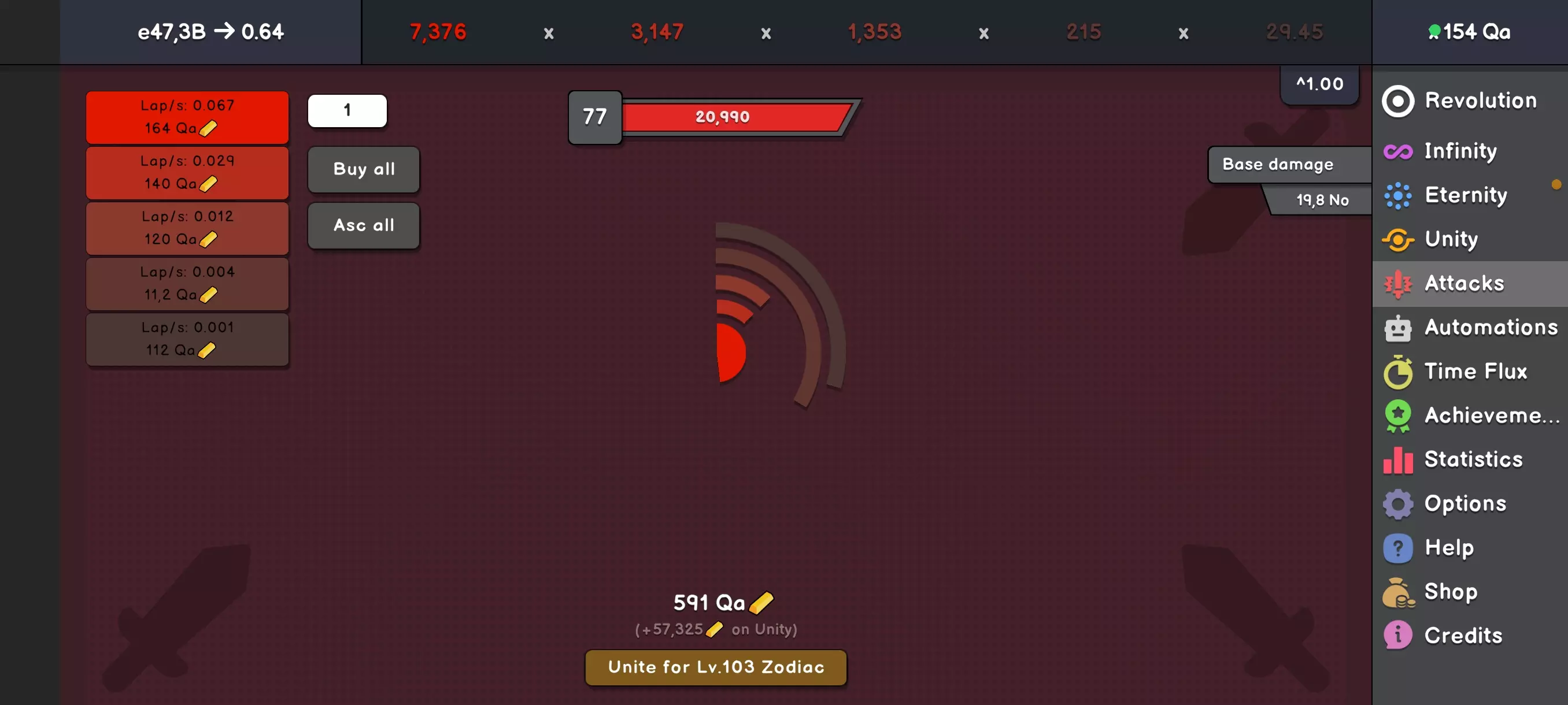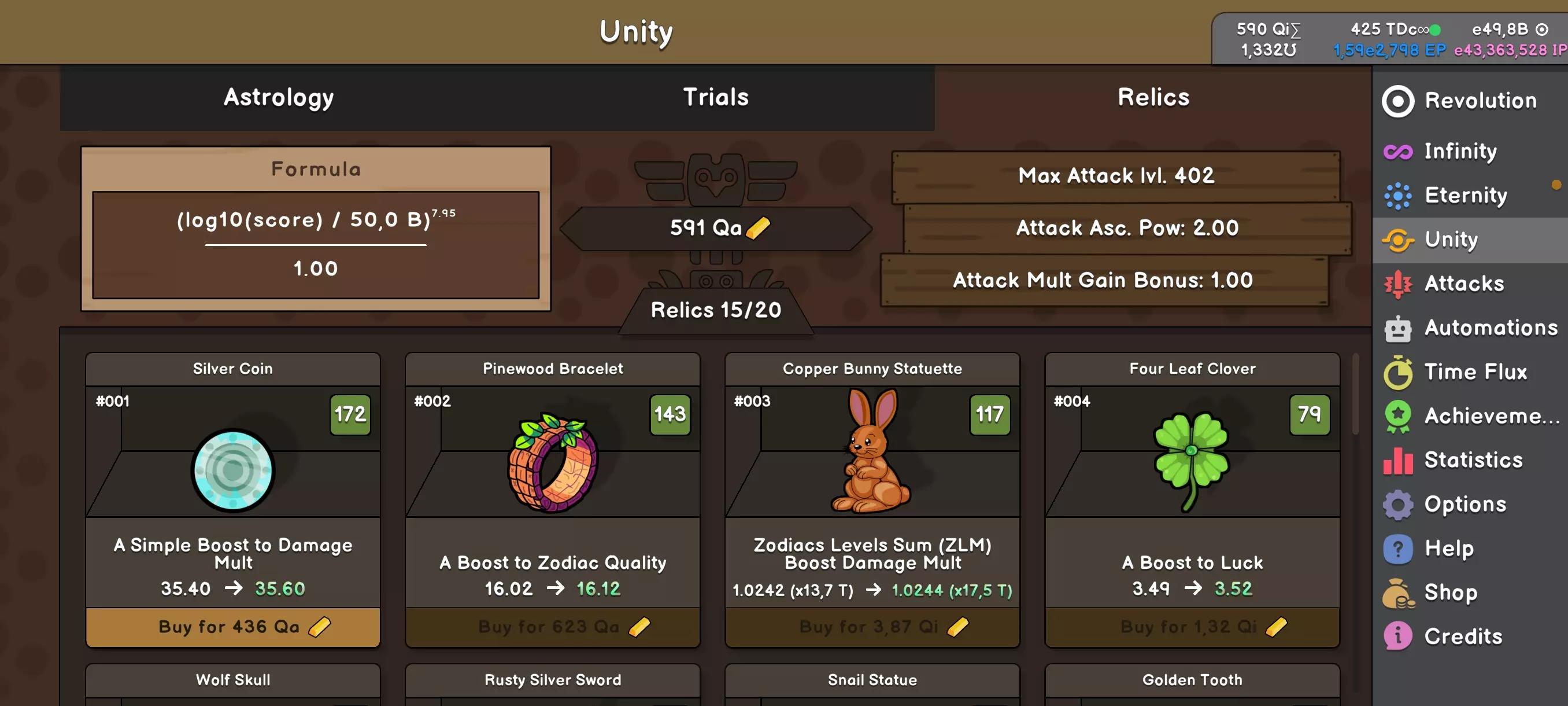 “Ataki”是Unity的最后阶段之一(至少目前是),有点像游戏初期的玩法。会出现一些圆圈,你可以升级它们并获得分数。不同之处在于,在重置(选择星座的Unity)后,圆圈会保留它们的等级,而你会获得一定数量的金币,可用于升级圆圈或购买遗物(Relics)。你达到的等级(圆圈上方的进度条)越高,获得的金币就越多。重置后等级会归零。卡在某个等级了?那就去提高你在主游戏中的分数并升级遗物吧。