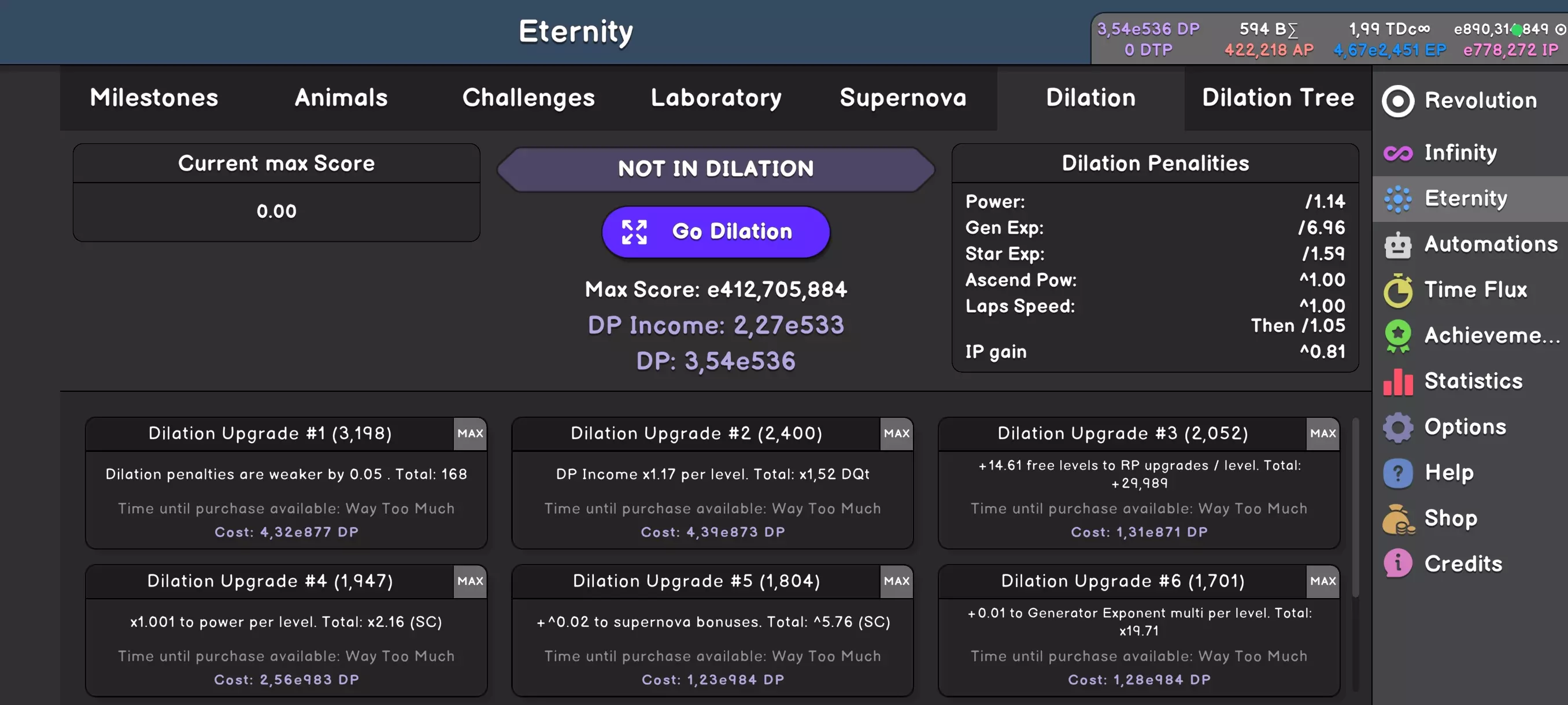如果要把“Dilation”比作什么的话,那它就像是一个对你施加的诅咒。你本是个超级运动员,能举起重物、跑步、游泳,结果一个邪恶女巫对你下了咒——现在你走一小段路就累得不行,抬个手都觉得酸痛。“Dilation”就是这种感觉。 在右上角你能看到诅咒状态——各项属性的削弱非常明显,而且启动“Dilation”后,获得的点数会急剧减少。不过情况也没那么糟,屏幕下方会显示游戏的便利功能——你只需要投入点数就行。另一个优点是,一旦你启动并停止了“Dilation”,你所达到的最高成绩将提供稳定的点数收益——即使“Dilation”处于非活动状态。启动膨胀模式,争取获得不错的成绩,然后关闭它,处理其他事务,购买强化道具,完成挑战,升级实验室,通过超新星进行重置,以更强的状态回到膨胀模式,同时分配点数。 完成所有挑战后,你将解锁膨胀树。这是目前游戏中的最后一项功能,能够显著提升实力。但遗憾的是,它相当复杂,需要你仔细理解。