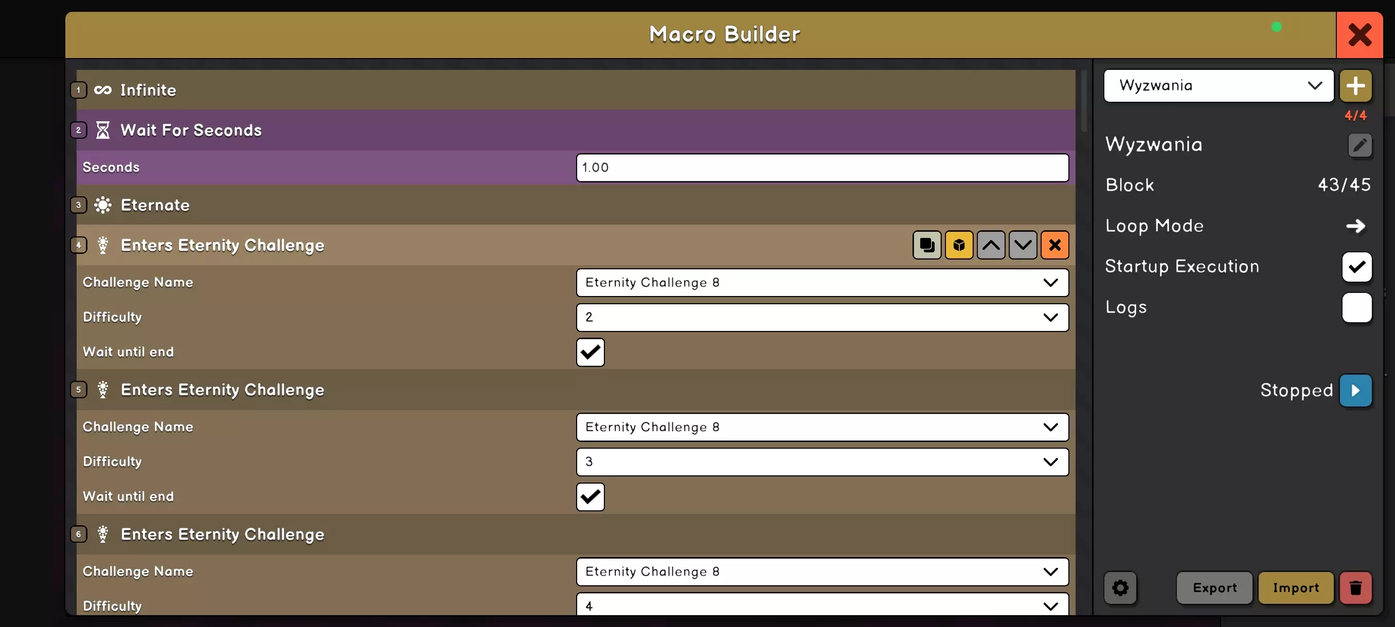 Unity 的核心在于不断重复某些操作,一遍又一遍。虽然最初的重复可能还比较慢,而且可以不用宏来完成,但后续的重复会变得让人难以忍受。 什么是宏呢?宏是一种记录下来的操作模式,用于规定电脑/手机应如何运行。简单来说,如果你有模式化的操作(按相同顺序重复执行相同操作),就可以将其自动化。这有点像编程,但这里是通过拼接模块来实现的。 如何编写宏呢?最好先思考一下可以将哪些操作自动化,然后拿一张纸,按顺序记录下你的操作步骤。例如:Eternate(永恒)、Dillate on(膨胀开启)、等待5秒、Dillate off(膨胀关闭)、挑战10-1、等待3秒、挑战10-2、等待10秒、挑战10-3、挑战10-4、Dillate on(膨胀开启)、等待5秒、Dillate off(膨胀关闭)、挑战10-5、升级中心1×5。然后用方块搭建出同样的结构并按下“播放”。如果一切顺利就没问题,要是宏在某个地方卡住了,你就得进行修正。随着时间推移,你会制作出越来越好的宏。 不过,让我们回到游戏本身。 Unity是什么?