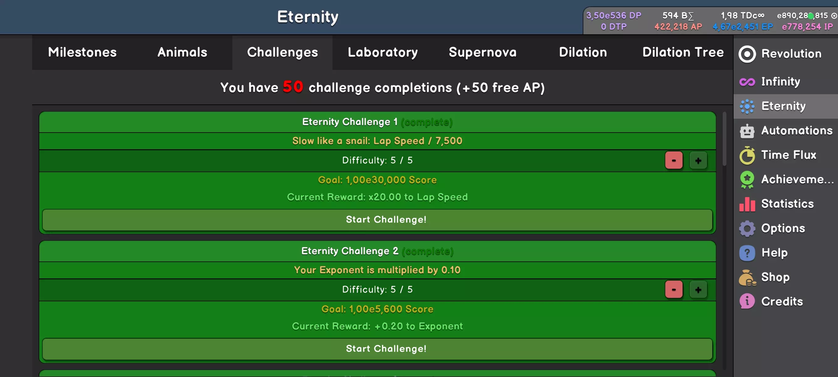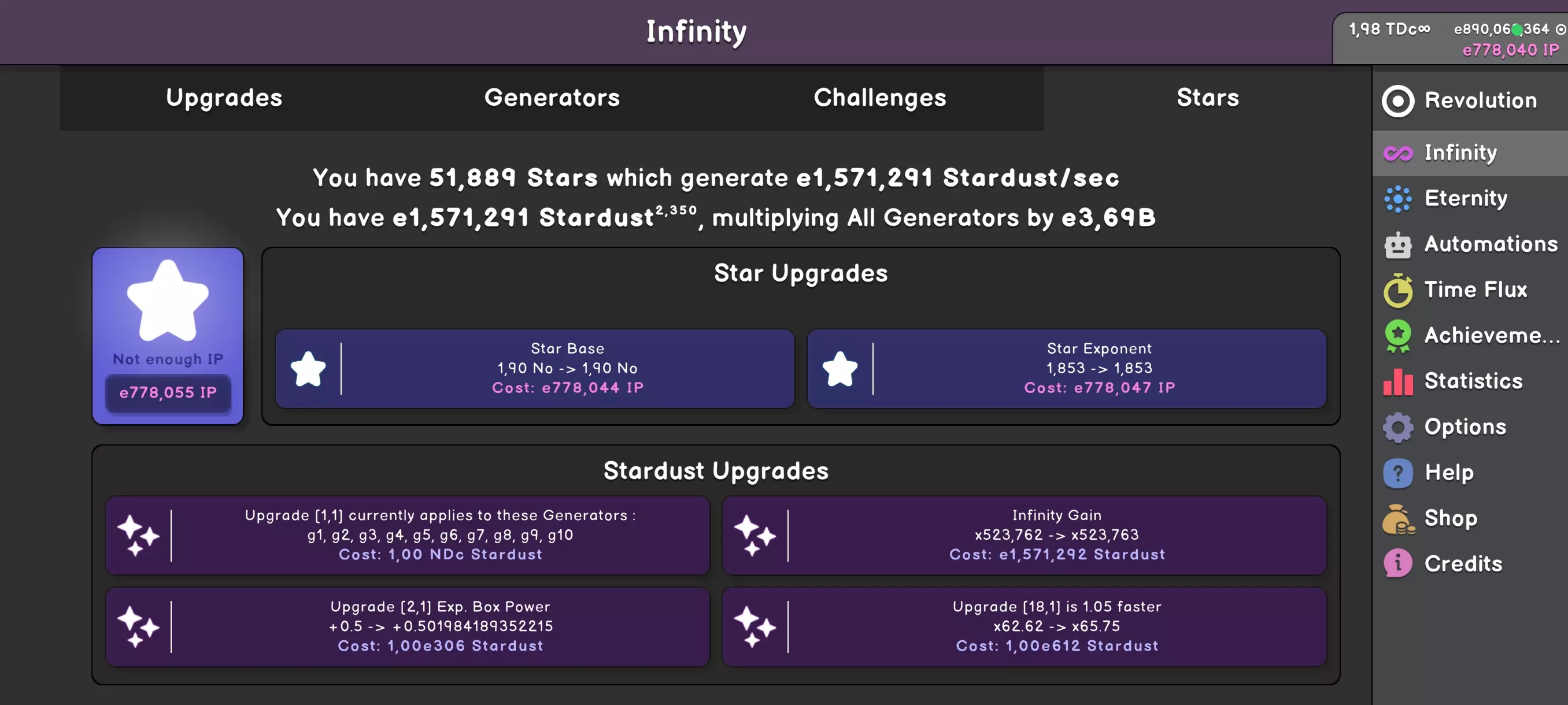 进入星辰之中,永恒不再是遥不可及的目标,而是你即将达成的终点。目前,你的主要任务仍是收集IP,但这次IP将直接影响发电机的效率,并且通过星尘升级,还能提升其他各项属性。 星辰系统的机制十分简单,无需过多赘述——你只需购买所有可购物品,不要忘记购买发电机。不断转动成果,直至达成永恒。 **减速功能** 随着游戏进程,你将解锁一个有趣的功能——减速。该功能会降低游戏速度,作为交换,你的得分将会提高。 本次没有截图,因为该功能仅有3个按钮。当屏幕上出现“Slowdown”按钮时,你便可以调整游戏速度了。我在网上看到有人把这个比作汽车的变速箱,但我个人并不认同这种说法。 这个功能非常简单——你需要让每种颜色的转速至少达到10转/秒(固定颜色),然后通过牺牲部分转速来提升“飞升之力”(Ascension Power)。换句话说,这些圆圈转得更慢了,但能产生更多点数。值得这么做吗?在不过度使用的前提下是值得的——你可能会挂到“过高的挡位”,从而失去点数生成。好在可以通过“加速”(speedup)按钮来撤销操作。 永恒(Wieczność)——里程碑、动物、挑战、实验室、超新星。 游戏的下一个阶段,新的货币。 早上好,在获得第一个“永恒点数”(EP,Eternity Point)后,就会解锁永恒玩法。它的第一阶段是里程碑,有点类似于前作中的任务。