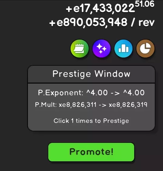 声望系统可根据通过声望指数(P. Exponent)修改获得的点数来提升加成系数,并为乘数添加额外的灰色(P. Multi)。这两项都能显著加快点数获取速度,但**会将进度重置为零**!你必须意识到,进行小型声望提升并不值得,因为这只会不必要地延长点数收集时间。不过,这是一项强大的功能,你需要学会何时使用它。 幸运的是,声望功能不会让你倒退。你可能会减慢进度,但总体上你会获得更多收益。 假设你进行第一次声望提升——指数会增加到1.02,乘数增加到x7。你从零基础开始,但实际上达到同一阶段会花费更少时间,因为你获得的收益大约是游戏初期的8倍。游戏不允许你降低声望等级,所以你只能不断前进。 当你获得更多声望点数后,会解锁晋升选项。这是一个强大的功能,但如果使用不当可能会减缓进度。晋升后,你将失去之前积累的所有东西——颜色和声望,需要完全从零开始。听起来很可怕,对吧?如果操作失误确实会这样。 晋升共有4种选择: #1. 收益倍率提升 - 提高声望获取速度 #2. 圈速倍率提升 - 加快圆圈填充速度 #3. 飞升之力 - 提升飞升后圆圈得分的倍率 #4.促销之力 - 强化其余3个促销。 每个促销在游戏的不同阶段都极为有用。若首次促销选择不当,你将不得不从头开始游戏——例如选择4号促销。 我个人选择了1号促销,结果却很失望。尽管我有很多点数,但从头开始后并未看到任何变化。于是我在手机上卸载了游戏,重新安装后从云端加载了旧存档,继续专注于提升声望。这真是个好主意。更高的声望能为促销提供更多经验,从而可以直接购买更高级别的促销。这是一种压力更小的解决办法。 那么,首先该购买什么呢?我个人推荐#1。它能显著加快声望获取速度,进而更快购买后续促销。你一直玩到触及第一个“无限”(Infinity)。 成就 到目前为止,你已经获得了不少成就。也许是无意为之,也许是刻意达成,但你肯定已经拥有一些了。