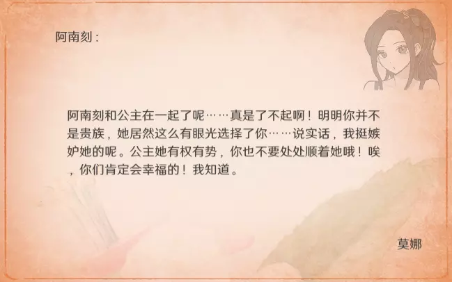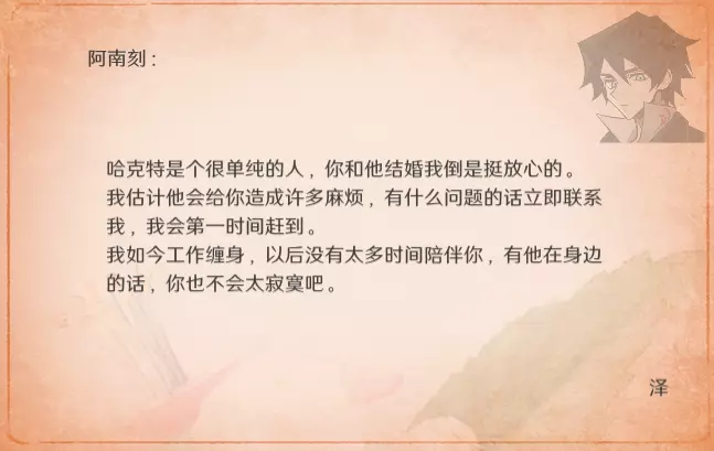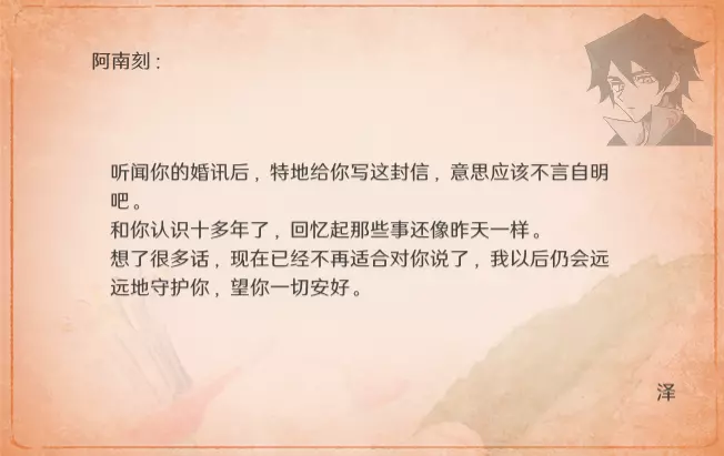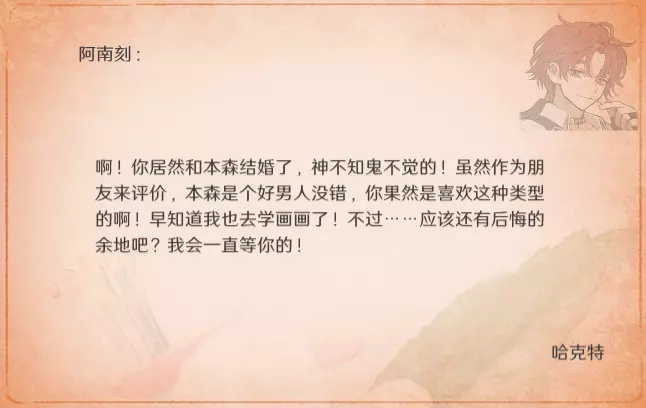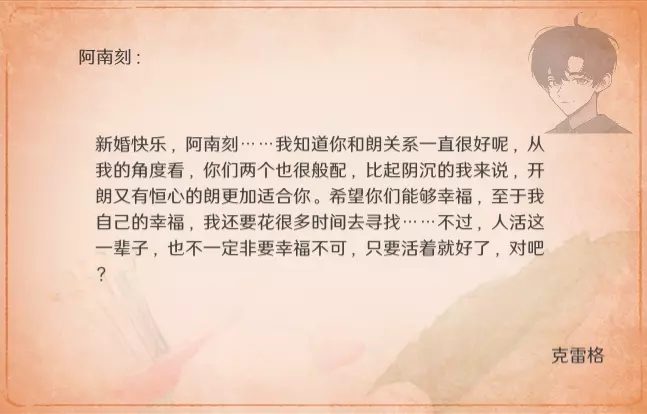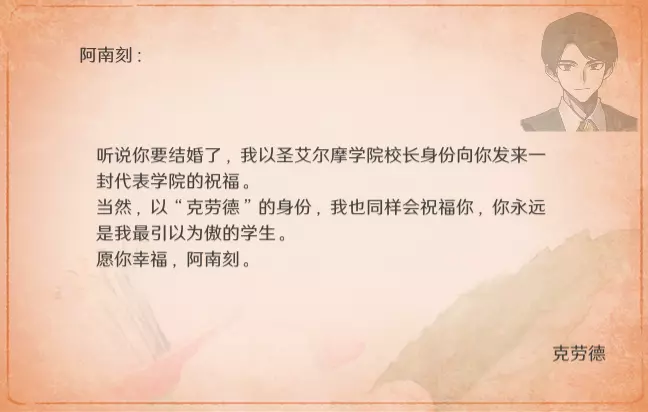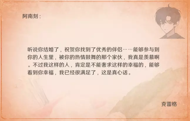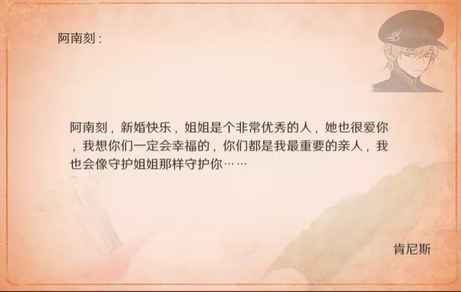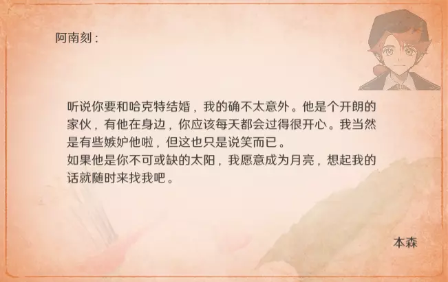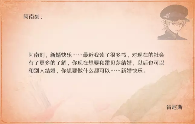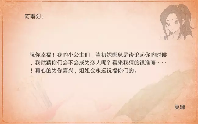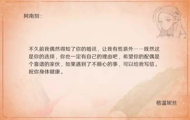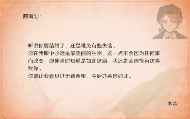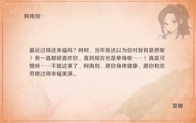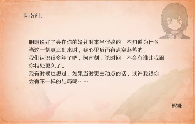 特别的信 最近更新后,卧室内新增了收集要素。不过更新前已刷出的信件不会被记录,这里也一并收录,将按照卧室内信件的展示顺序进行更新。 妮娜 与莫娜结婚时