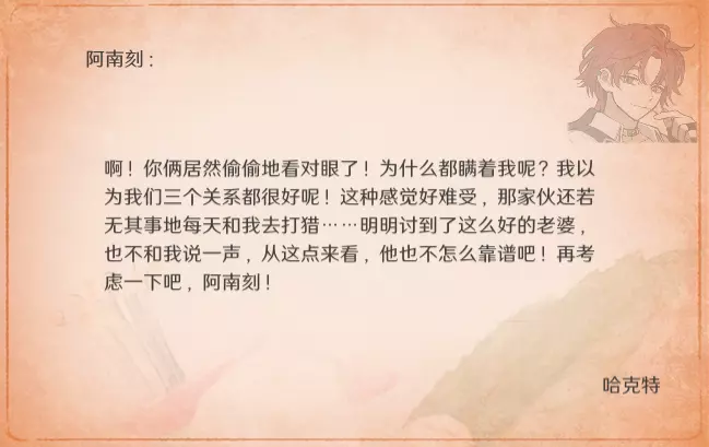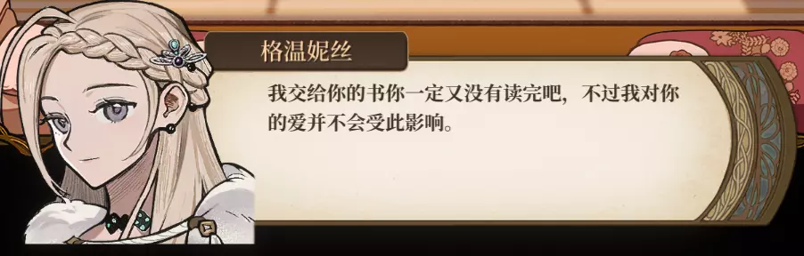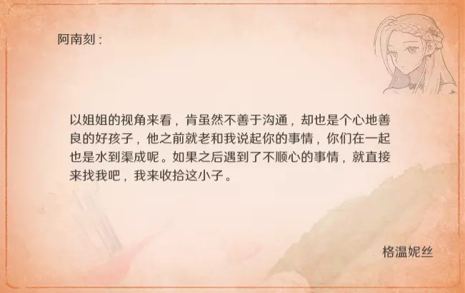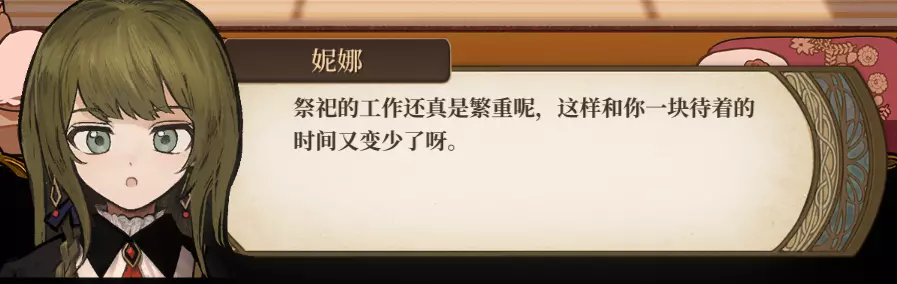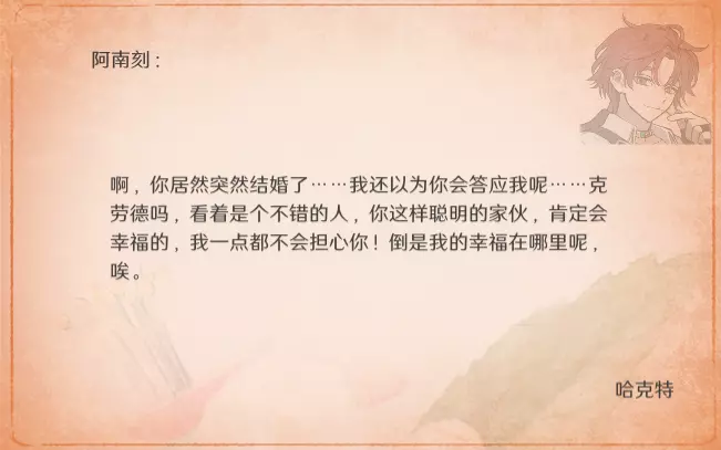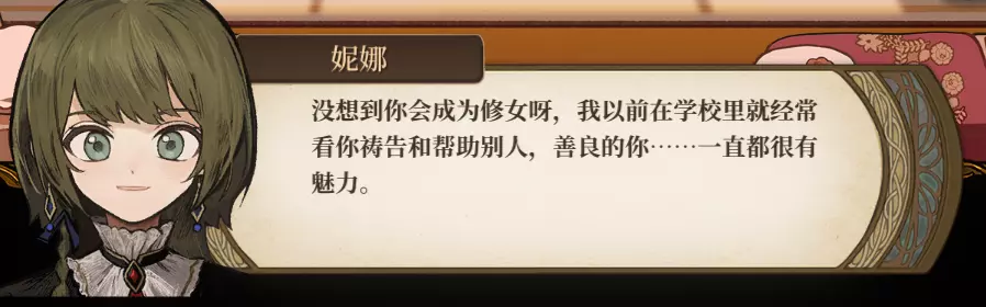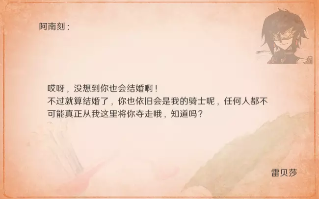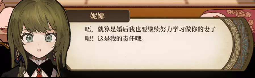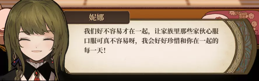由于是通关后要素,所以含剧透成分,想要保持良好游戏体验的玩家可以通关后再来看。 方便想要解锁台词和查看台词的玩家浏览。 每个角色共10段婚后台词,其中: - 5段为通用台词,与角色的邀约、个人剧情以及后日谈有关,随卧室中的角色一同解锁; - 5段为对应女儿职业的台词,即满足对应职业通关后才能刷出对应的台词(注:不需要职业+对应角色通关,只需要该职业通关即可刷出)。 更新:增加了特别的信。 台词收录(泽-妮娜)