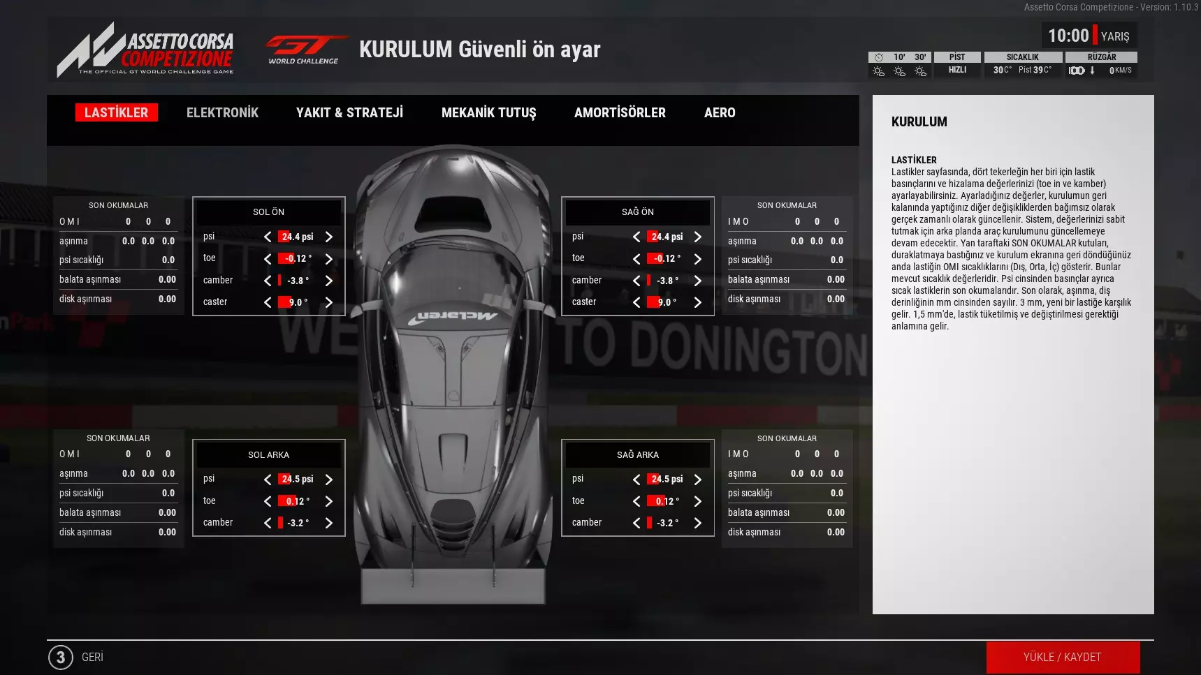 🛞Lastikler ⚡️Elektronik ⛽Yakıt&Strateji 🔧Mekanik Tutuş 💈Amortisörler 🦾Aerodinamik 🛞PSI PSI (Pounds per Square Inch), lastiklerin basıncını ölçmek için kullanılan bir birimdir. Lastik basıncı, aracın yol tutuşu, sürüş konforu ve güvenliği üzerinde doğrudan etki eder. Doğru PSI değeri, lastiklerin sağlıklı bir şekilde çalışmasını sağlarken, lastik ömrünü de uzatır. Pistlere göre lastik basınçları değişkenlik gösterebilir. Bazı pistlerde sağa viraj daha çokken, bazı pistlerde sola viraj daha fazladır ve sağ ve sol lastik basıncı değerlerini ayarlarken bunlarda göz önünde bulundurulmalıdır. 🔻Kuru ve Islak Zeminde Lastik Basıncı: 1. Kuru Zemin (Normal Sürüş Koşulları): Ön lastikler: 26 - 27 PSI Arka lastikler: 26 - 27 PSI Kuru zemin üzerinde, genellikle 26 - 27 PSI arası basınç, lastiklerin düzgün bir şekilde yere temas etmesini ve optimal yol tutuşu sağlar. Bu değer, lastiklerin düzgün şekilde açılmasını ve yol ile daha iyi bir temas kurmasını sağlar, bu da güvenli sürüş için gereklidir. 2. Islak Zemin (Yağmurlu veya Kaygan Yollar): Ön lastikler: 30 - 31 PSI Arka lastikler: 30 - 31 PSI Islak zemin koşullarında, lastiklerin daha iyi su tahliye kapasitesine sahip olması ve yol ile daha iyi bir temas kurabilmesi için basıncın biraz daha düşürülmesi önerilebilir. Genelde 30 - 31 PSI arasında bir değer, lastiklerin zeminle daha iyi temas etmesini sağlar ve suyun lastiklerin altından daha verimli bir şekilde tahliye edilmesine yardımcı olur. 🔻Neden PSI Değeri Önemlidir? Düşük PSI: Lastikler yeterince sert olmadığı için daha fazla esner, bu da aşırı ısınmaya, daha fazla lastik aşınmasına ve kötü yol tutuşuna yol açabilir. Ayrıca yakıt verimliliği düşer. Yüksek PSI:Lastikler daha sert olur, bu da yola daha az temas eder. Yüksek PSI, direksiyon tepkilerini artırabilir, ancak aynı zamanda sürüş konforunu azaltır ve lastiklerin yol tutuşu azalabilir, özellikle ıslak zeminlerde tehlikeli olabilir. 🔻Özet:Kuru zeminde ideal lastik basıncı 26-27psi iken, ıslak zeminde 30-31psi değerlerindedir. Eleme turlarınızda yada yarışlarınızın başlangıcında 1-2 tur daha güvenli bir sürüş yapmak lastiklerin ısınıp daha iyi tepkiler vermesini sağlayana kadar doğru bir taktik olacaktır. 🛞Toe Toe, direksiyon ve tekerleklerin yönünü belirler. Toe, aracın ön veya arka tekerleklerinin birbirlerine göre içeriye veya dışarıya doğru açı yapmasını ifade eder. Başka bir deyişle, tekerleklerin "parmak uçları" bir araya gelecek şekilde mi yoksa birbirinden uzak mı olduğunu belirler. Doğru ayar yapıldığında aracın yol tutuşu üzerinde önemli bir etkiye sahip olur. 🔻Toe Çeşitleri: Toe-in: Toe-in ayarı, stabilite sağlar ve aracın düz yolda daha düzgün gitmesini sağlar. Tekerleklerin ön kısmı, arka kısmına göre biraz daha içeriye yönelir. Genellikle daha stabil bir direksiyon tepkisi ve daha az direksiyon kayması sağlamak için kullanılır. Eğer çok fazla toe-in varsa, lastiklerin aşınma oranı artabilir. Toe-out: Toe-out ayarı ise hızlı dönüşlerde ve virajlarda aracın daha çabuk tepki vermesine yardımcı olur. Tekerleklerin ön kısmı, arka kısmına göre dışarıya doğru açı yapar. Yüksek hızlarda daha fazla dengesizlik yaratabilir, ancak hızlı dönüşlerde tekerleklerin daha hızlı tepki vermesini sağlar. Eğer çok fazla toe-out varsa, aracın virajlardaki stabilitesi azalabilir ve lastiklerin erken aşınmasına yol açabilir. 🛞Camber Camber, aracın tekerleklerinin dikey açı ile ilgili bir terimdir. Başka bir deyişle, camber, tekerleklerin aracın gövdesine göre dikey açısını ifade eder. Bu açı, tekerleğin üst kısmının, alt kısmına göre daha içeriye (pozitif camber) veya dışarıya (negatif camber) doğru olup olmadığını gösterir. 🔻Pozitif Camber (Positive Camber):Tekerleğin üst kısmı, alt kısmına göre dışa doğru eğik olur. Genellikle yüksek hızlarda daha fazla stabilite sağlamak için kullanılır, ancak virajlarda daha az yol tutuşu sunar. Özellikle arka tekerleklerde kullanılan bir ayar olabilir çünkü bu, aracın düz yol tutuşunu iyileştirebilir. 🔻Negatif Camber (Negative Camber):Tekerleğin üst kısmı, alt kısmına göre içeriye doğru eğik olur. Virajlarda daha iyi yol tutuşu sağlar, çünkü tekerlek, viraj alırken daha iyi bir yüzey teması kurar. Ancak, fazla negatif camber, düz yolda aşırı lastik aşınmasına neden olabilir. 🔻Sıfır Camber (Neutral Camber):Tekerlek tamamen dikeydir, yani ne içeriye ne de dışarıya eğik değildir. Bu, aracın düz yolda daha düzgün gitmesini sağlar, ancak viraj alırken lastiklerin zemine temas açısı daha az olacağından viraj performansı sınırlı olabilir. 🛞Caster Caster aracın ön tekerleklerinin yönlendirme ekseninin dikey eksene göre yaptığı açıyı ifade eder. Başka bir deyişle, caster, tekerleklerin yönlendirme özelliği ve direksiyonun tepkisini etkileyen bir terimdir. 🔻Direksiyon Tepkisi: Pozitif Caster: Eğer tekerleğin yönlendirme ekseni, araç gövdesine göre öne doğru eğikse (yani pozitif caster), direksiyon daha stabil olur ve araç daha düz gider. Bu, özellikle yüksek hızda daha stabil bir sürüş sağlar. Negatif Caster: Eğer tekerleğin yönlendirme ekseni arkaya doğru eğikse (yani negatif caster), araç daha hızlı ve hassas tepki verir, ancak genellikle daha zor kontrol edilebilir olur. Bu durum, kısa süreli yüksek hassasiyet gereksinimlerinde tercih edilebilir. 🔻Stabilite ve Dönüş: Pozitif caster, özellikle yüksek hızda daha fazla stabilite sağlar. Çünkü bu ayar, direksiyonun merkezlenmesini sağlar ve tekerleklerin düz yolda otomatik olarak tekrar ortalanmasına yardımcı olur. Bu, güvenlik açısından da önemlidir çünkü yüksek hızda aracın k