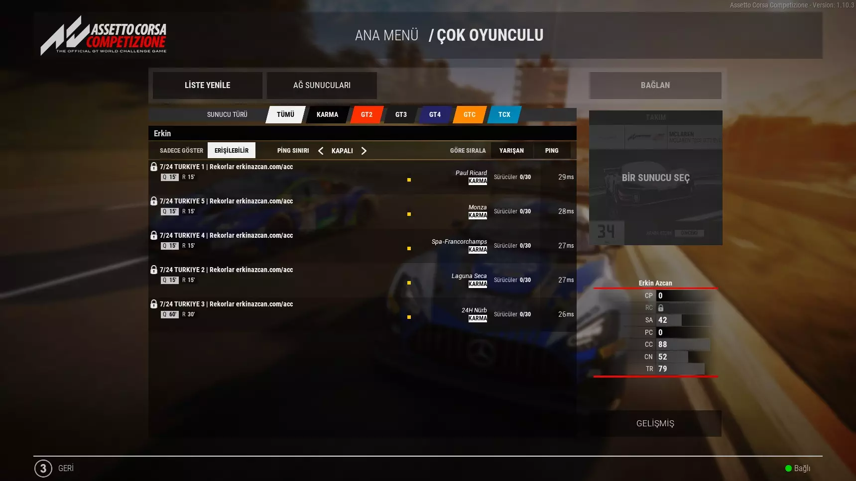 补丁安装步骤 1. 将压缩包内的AC2-WindowsNoEditor_TR.pak和AC2-WindowsNoEditor_TR.sig文件放入游戏目录下的Paks文件夹中。 (默认路径:C: Program Files (x86) Steam steamapps common Assetto Corsa Competizione AC2 Content Paks) 2. 在Steam库中右键点击《神力科莎:争锋》,进入属性,在“启动选项”中输入“-fileopenlog”。 土耳其服务器