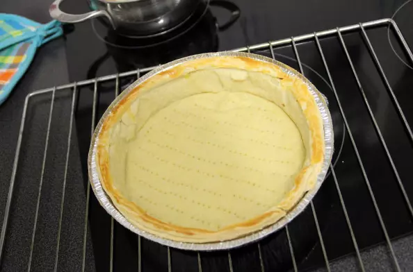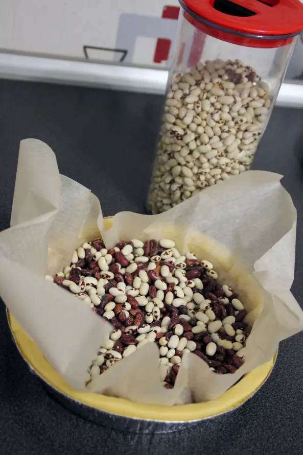 为增加光泽,可在边缘涂抹蛋黄。使用烘焙纸,将豆类或豌豆放入烤盘,以180°C烘烤约15分钟。这样做是为了防止形状散开。