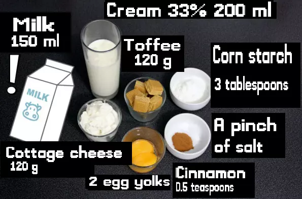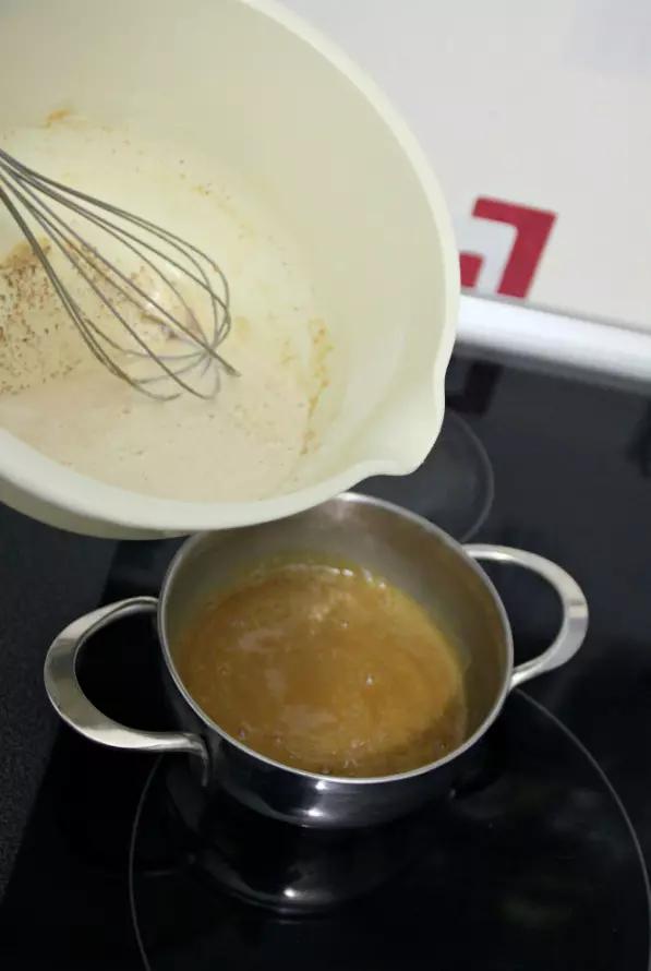 将蛋黄、肉桂、盐、淀粉和剩余的牛奶混合。把混合物加入太妃糖中。