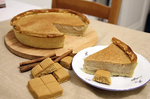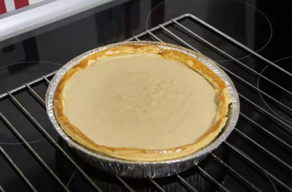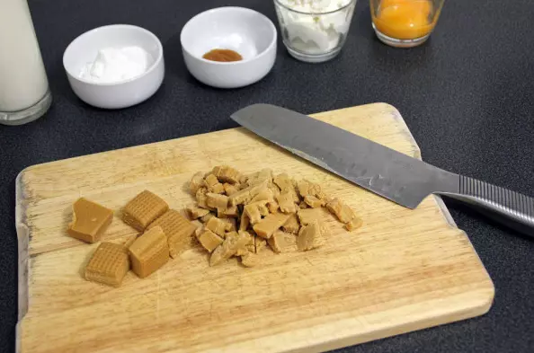我们准备馅料并完成派的制作 我们会将太妃糖磨碎,搅拌后加入一半的牛奶将其融化。