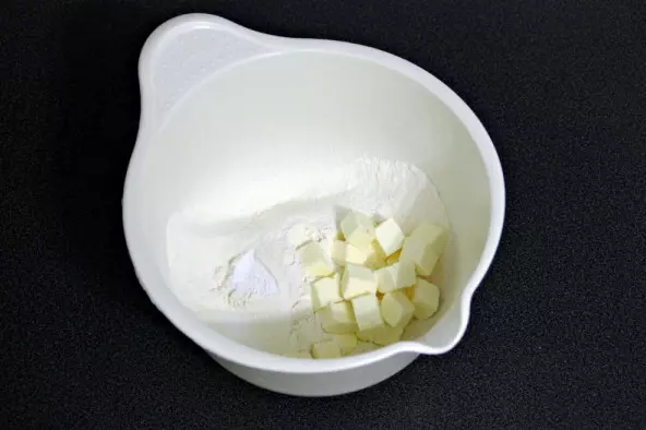 派模的准备与塑形 将面粉、盐、泡打粉混合搅拌,加入软化的黄油。搅拌至形成碎屑状。