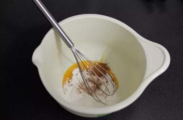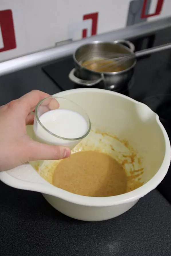 现在我们把所有材料混合在一起,然后倒入调好的馅料!馅料会是液体状态,不用害怕。
