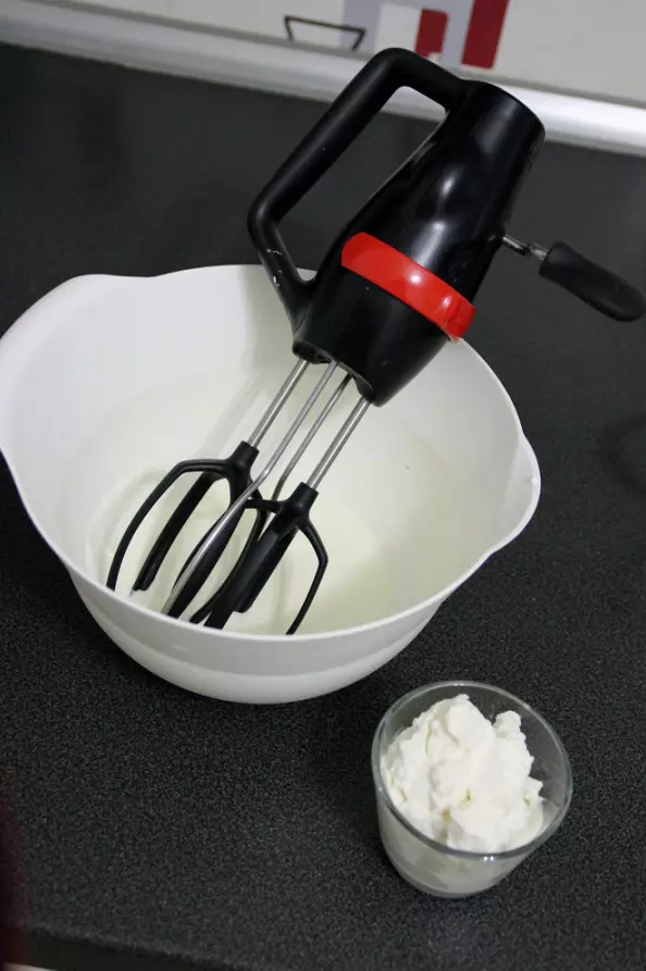 将奶油打发至干性发泡状态,然后加入凝乳奶酪。