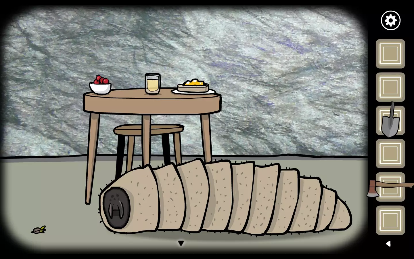 你需要给他:森林某处蜂巢里的蜂蜜(获取蜂蜜需要解开一个谜题)、右侧植物上的浆果,还有一棵标有X的较小树木,放大后用斧头砍它,就能得到一罐树液。 当你把这三种材料都放在他的桌子上时,他会吸引大量苍蝇,被苍蝇群围攻后变成……一只会吐口水的恶心大幼虫。