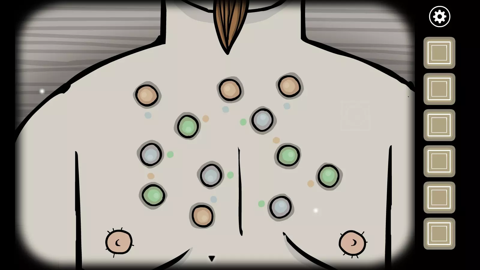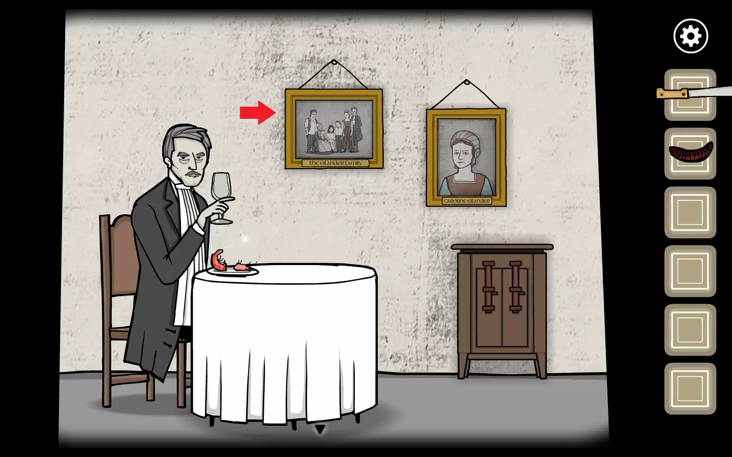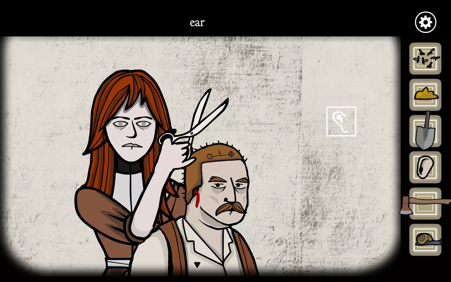 找到剪刀后,回到森林里的房子,把剪刀交给妹妹,让她帮叔叔剪头发。虽然把锋利的工具交给盲人是个糟糕的主意,但还是要这么做。持续点击叔叔的头发,直到妹妹最终剪下他的耳朵。点击耳朵即可获得成就。这也是剧情相关的内容,因为你需要用这只耳朵来解决另一个谜题。