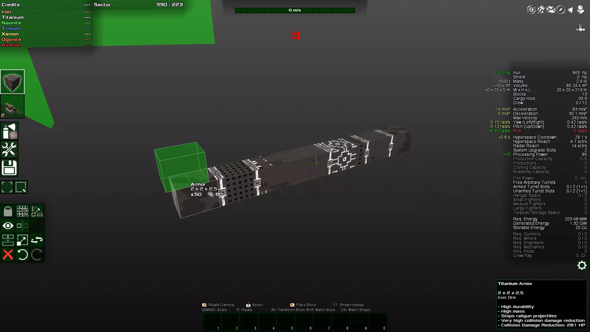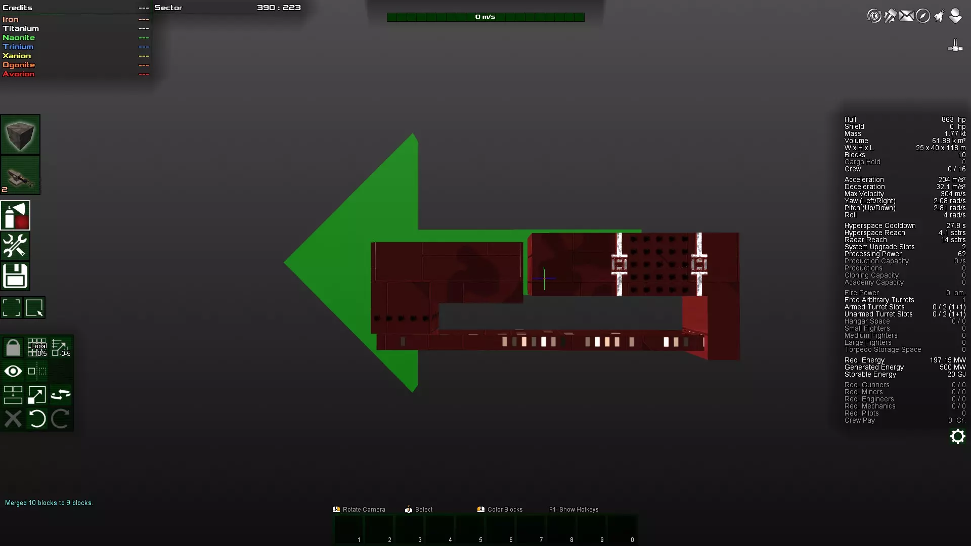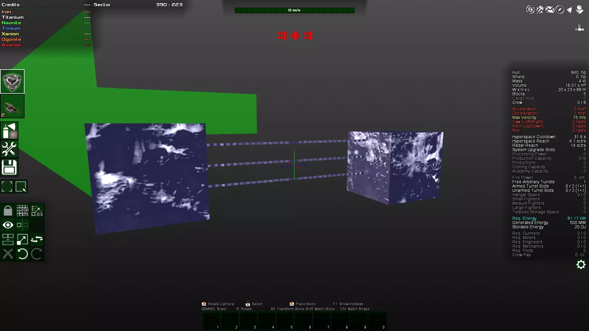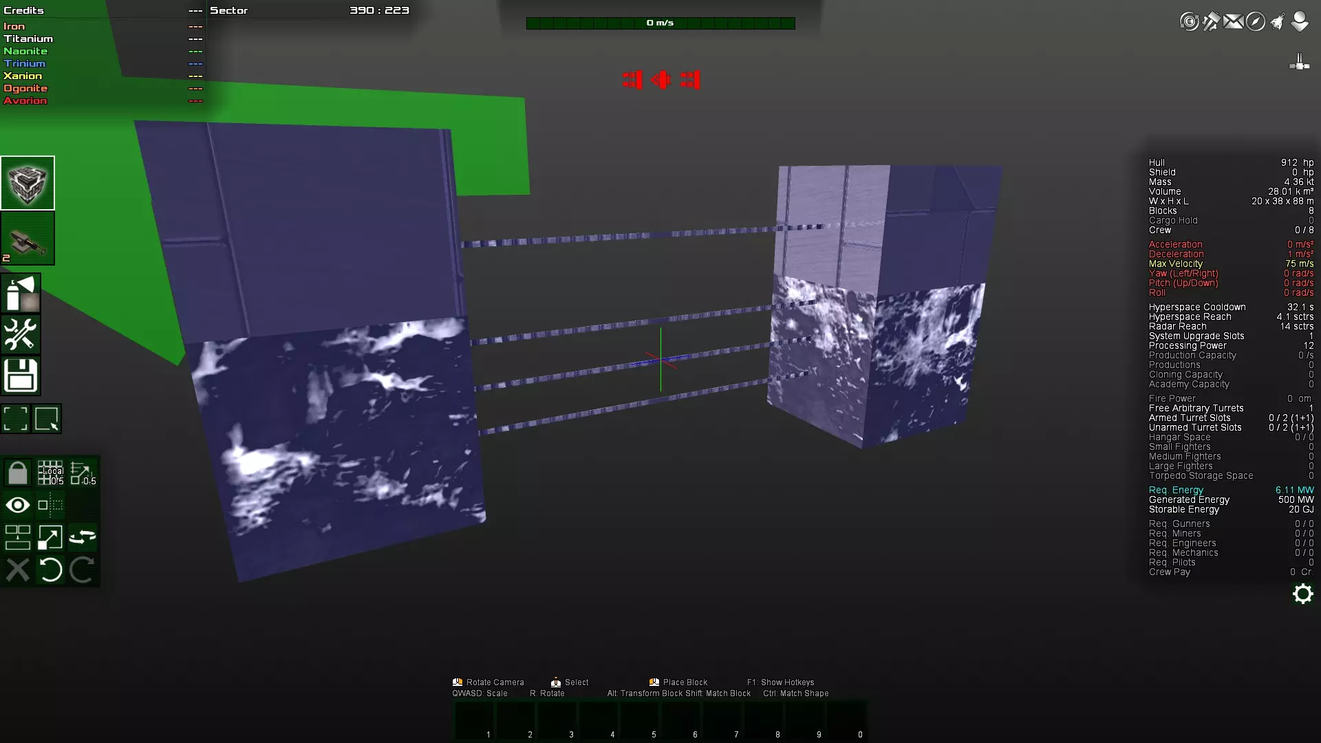 如你所见,那个角块变得多余了,因为对角块实际上是相互连接的。因此,这个角块很容易被打掉,因为它不受机械结构的保护。如果不确定,可以在安全模式下尝试删除该方块。如果可以删除,那么它就不是连接的必要部分,因此算作与主体结构分离的独立连接部分,很容易被摧毁。 接下来,将两个装甲块都放在前面仍然不太好。更理想的做法是将装甲块放在飞船的中部,因为那里的转动惯量最小。