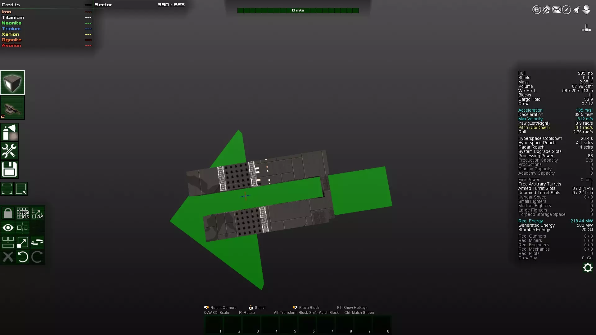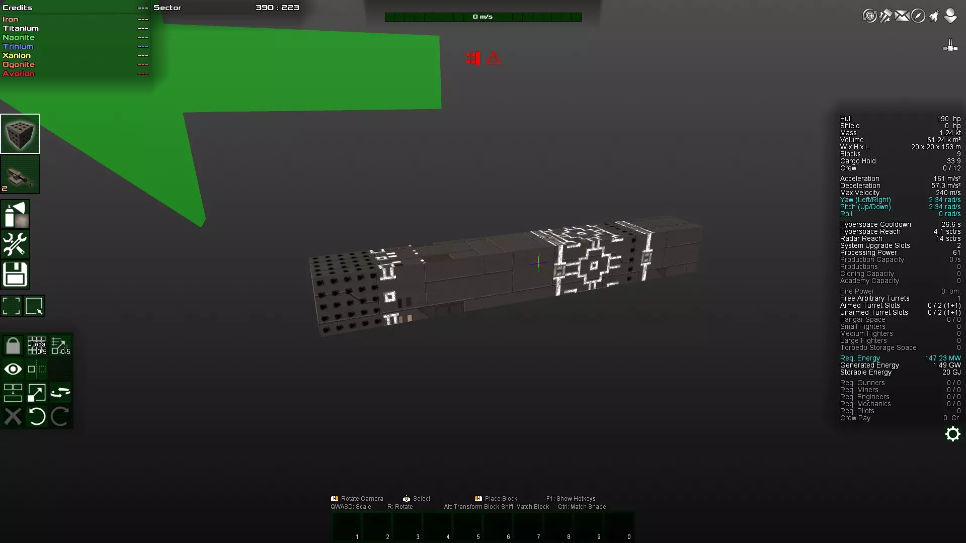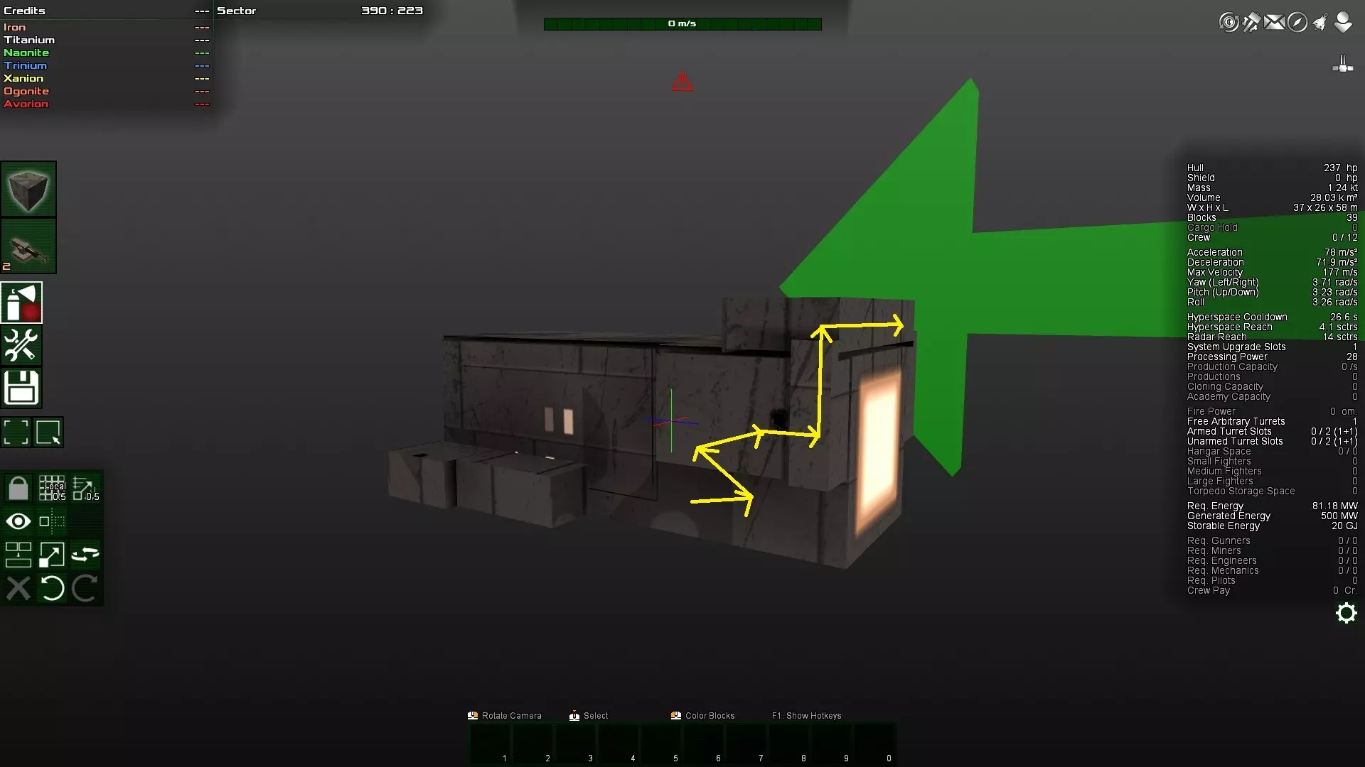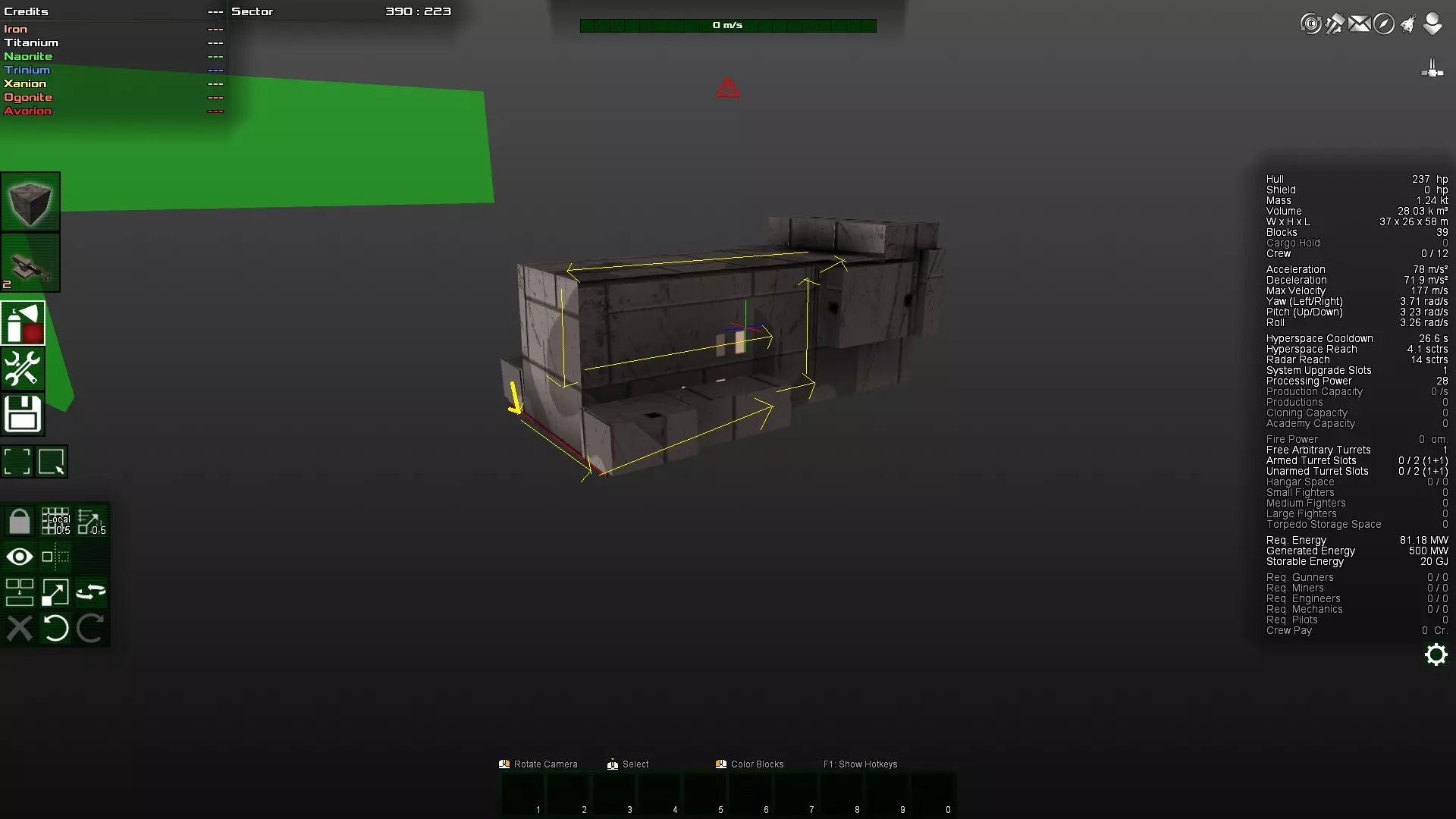 如你所见,那个角块变得多余了,因为对角块实际上是相互连接的。因此,这个角块很容易被打掉,因为它不受机械结构的保护。如果不确定,可以在安全模式下尝试删除该方块。如果可以删除,那么它就不是连接的必要部分,因此算作与主体结构分离的独立连接部分,很容易被摧毁。 接下来,将两个装甲块都放在前面仍然不太好。更理想的做法是将装甲块放在飞船的中部,因为那里的转动惯量最小。