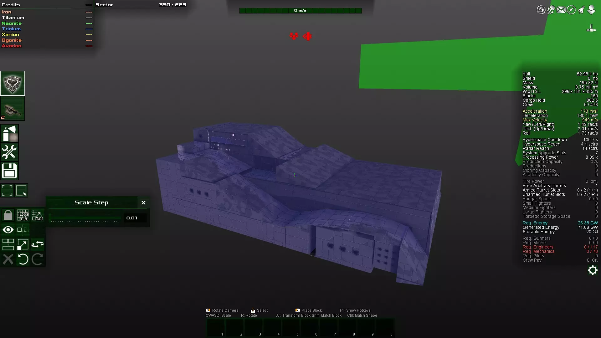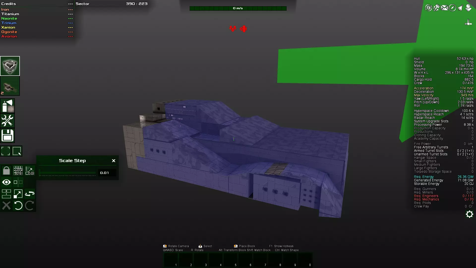 这就是SCA派上用场的地方。我在开发这种建造方法时,将其命名为“中央偏移装甲”(Shifted Centrally Armored)。 不再是为外部装甲以承受伤害,你可以将装甲置于中间。这本质上仍然是一种“杆状结构”,即只有一个连接从一端延伸到另一端。只是……它向内弯曲了。 这种设计保留了最大的机动性,而且在有“结构完整力场”的情况下,你的部件几乎不可能被击毁——因为它们继承了所有依赖该结构的模块的生命值,而借助“结构完整力场”,单是装甲的生命值就超过了整艘船的总和。 请注意,像轨道炮和加农炮这类武器仍会正常发挥作用。例如,轨道即便无法摧毁方块,仍能击中多层方块,因此为外部加装装甲仍是个好主意,只是现在你只需用尽可能薄的薄片来装甲即可。只要你的装甲也是这根长杆的一部分。 应用示例
