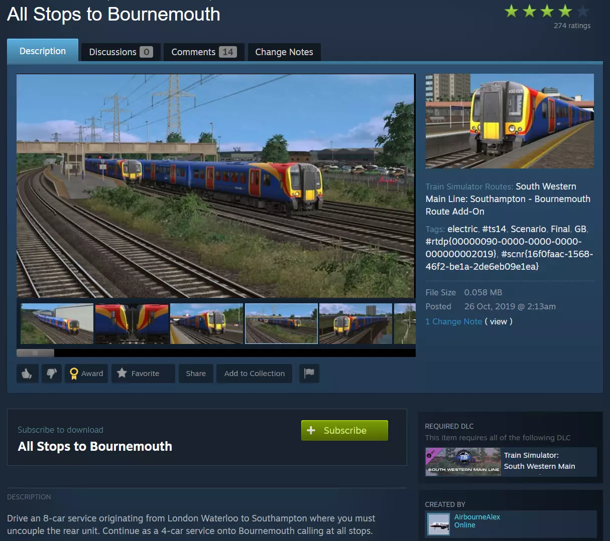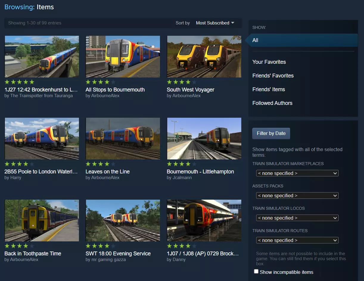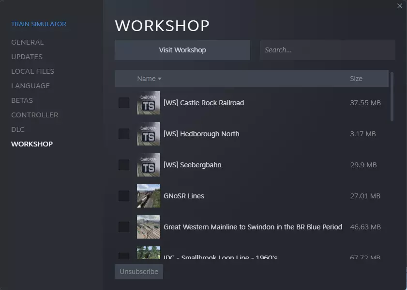 订阅功能有两个作用: - 标记该项目,以便下次启动游戏时下载到您的设备中。 - 标记该项目,使其能在未来有更新时自动下载并覆盖旧版本。 请注意:取消订阅只会禁用“更新覆盖”功能。项目本身仍会保留在您的游戏副本中,并且可以正常游玩。 如果您希望删除该项目,请按照本指南后续部分中说明的步骤操作。 订阅路线: 如果您订阅了创意工坊中的某个路线,您还可以订阅并运行所有为该路线制作的创意工坊场景。您也可以自行制作该路线的场景,并发布到创意工坊供他人游玩。从第一部分所述的菜单中浏览所有创意工坊路线。以下是相关链接: TSC Routes & Scenarios[www.railsims.com] 打开后,选择“Workshop”(创意工坊)类型。你也可以根据需要按地区筛选路线。