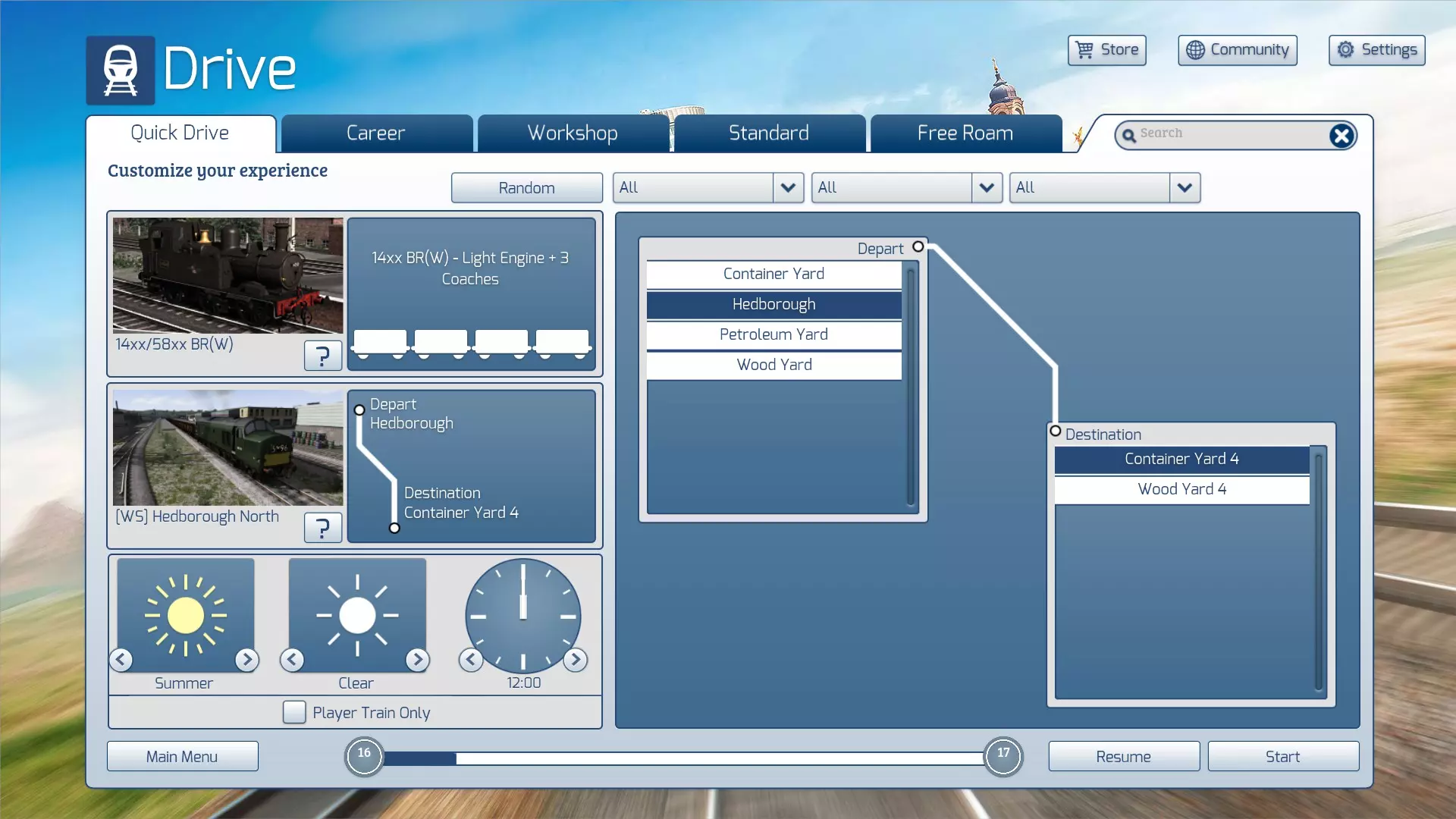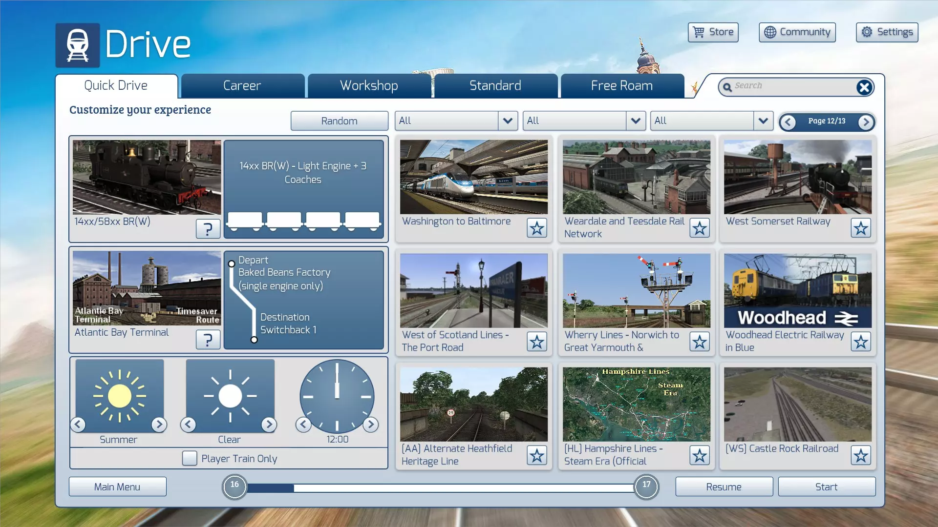 选择出发点 选择目的地 选择季节、天气和时间段(左下角方框) 选择是否排除AI列车(仅官方路线适用) 按下“开始”以启动快速驾驶场景 恢复丢失的路线 您的驾驶菜单中是否缺少某些创意工坊路线?有时,您可能会发现驾驶菜单中的大部分甚至所有创意工坊路线都消失了。幸运的是,这是缓存问题,可轻松解决。 1. 前往您的RailWorks文件夹。 2. 打开Content文件夹。 3. 删除以下文件: SDBCache.bin SDBCache.bin.MD5 RVDBCache.bin RVDBCache.bin.MD5 4. 现在重启《模拟火车》。这将重建您的路线数据库,所有之前消失的路线都将重新出现。运行时问题 点击“开始”按钮后,快速驾驶场景将加载到游戏中。在所有加载界面完成后,你可能会遇到类似以下的错误消息: