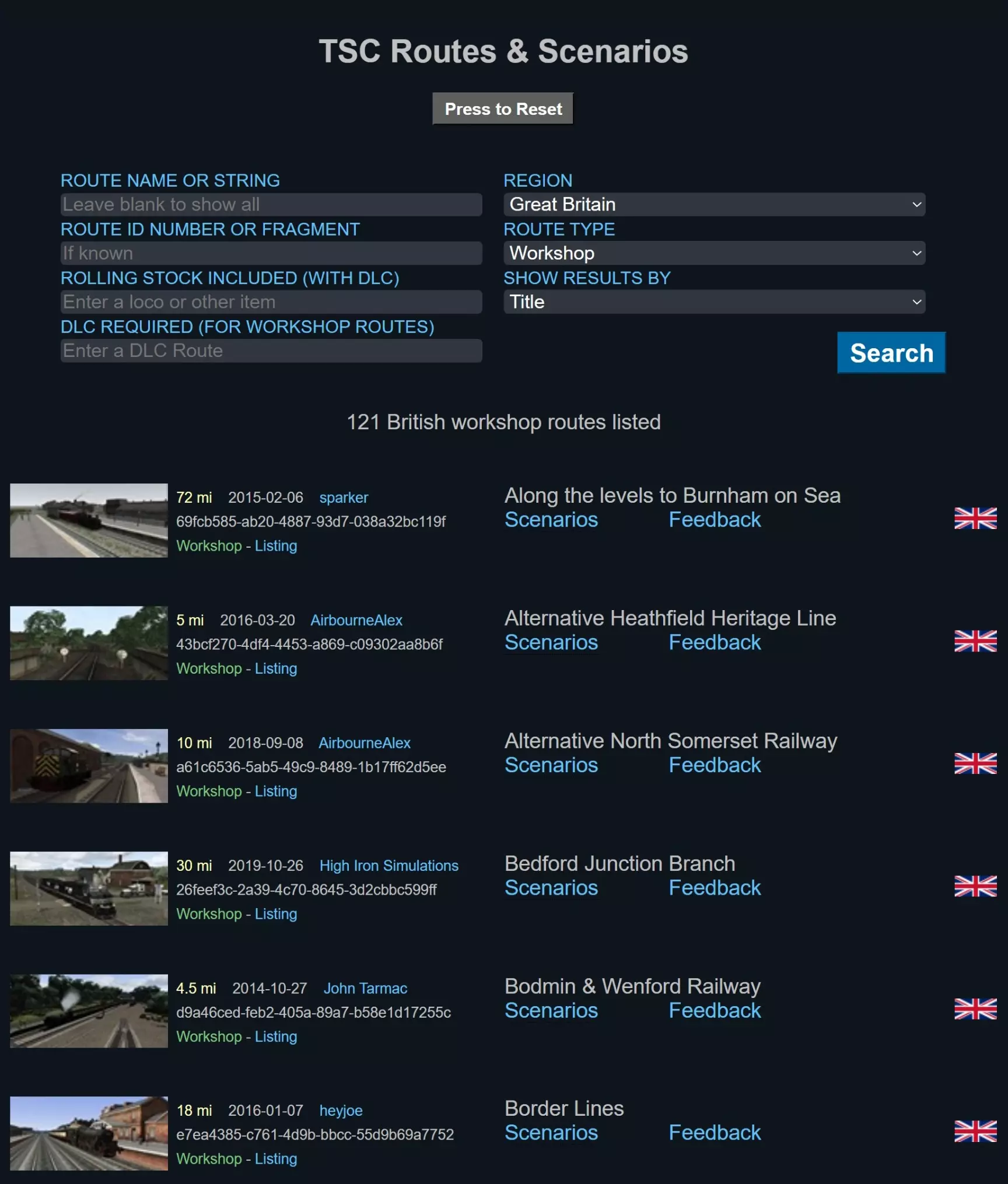 浏览创意工坊页面 在创意工坊页面中搜索特定物品,可能会感觉如同大海捞针。不过,我们为你准备了“磁铁”来提供帮助。 “大海”概况: - 超过29,000个创意工坊场景 - 近200条已完成的创意工坊路线,包含定制场景 - 超过500条开发中的创意工坊路线可供预览 由于Steam创意工坊的标签系统存在问题,仅使用标准搜索功能往往难以获得理想结果。为此,我们开发了两个高级界面,助你即时、精准地找到所需内容。 关于创意工坊物品的使用,还有其他重要细节将在本指南的后续章节中介绍。寻找物品 - 通过路线列表 大多数你在Steam上购买的《模拟火车》路线都附带少量为该路线专门创建的官方场景。不过,创意工坊中通常还有更多免费场景可供使用。 除了免费场景外,创意工坊中也有免费路线。 以下链接是查找所需内容的最佳方式: TSC Routes & Scenarios[www.railsims.com] 本指南将向你展示如何使用它。你将能够访问所有路线的创意工坊场景(点击一下即可从创意工坊中调出它们)。包含内容摘要: - 为线路专门编写的场景 - 线路长度 - 发布日期 - ID编号及地区 官方线路附加内容: - 使用该线路资产的场景 - 线路手册 - 商店页面链接 - 开发者链接 - 包含的机车和车辆(鼠标悬停线路标题查看) - 线路资产路径 - 任何包含的机车和资产包 创意工坊线路附加内容: - 反馈链接 - 创意工坊页面链接 - 作者链接 - 用作基础模板的DLC 该列表具备完整的搜索、排序和显示选项。 当然,除了场景外,你也可以找到免费的创意工坊线路进行下载并添加到你的收藏中。 点击即可访问,就是这么简单。 查找项目 - 通过快速查找器 另一种查找所需内容的方式是通过快速查找器。它甚至包含地图和路线文件夹编号。 你可以通过点击以下链接并从菜单中选择“快速查找器”来访问它。 TSC 工坊菜单[www.railsims.com]